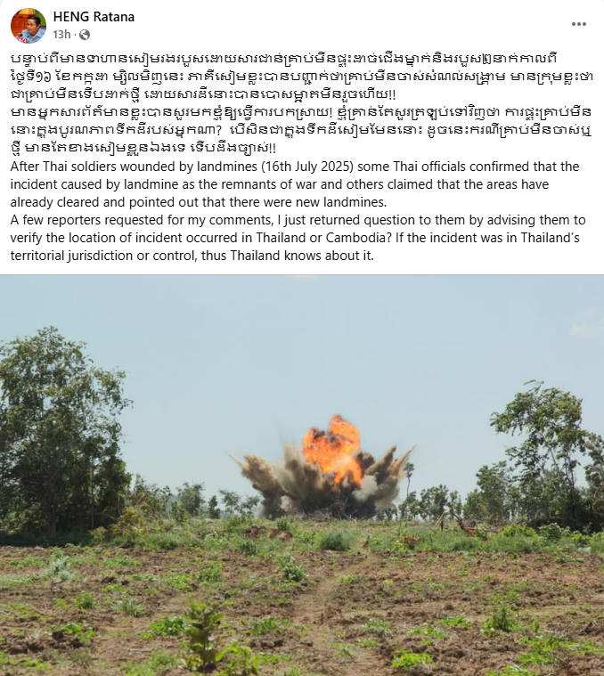(រាជធានីភ្នំពេញ)៖ កាលពីថ្ងៃទី ១៨ ខែកក្កដា ឆ្នាំ ២០២៥ នេះ ឯកឧត្តម ហេង រតនា ប្រតិភូរាជរដ្ឋាភិបាល ទទួលបន្ទុកជាអគ្គនាយក នៃមជ្ឈមណ្ឌលសកម្មភាពកំចាត់មីនកម្ពុជា (CMAC) បានបង្ហោះរមួយក្នុងផេកផ្លូវការរបស់ លោក ពាក់ព័ន្ធនឹងករណីទាហានថៃជាន់គ្រាប់មីន កាលពីថ្ងៃទី ១៦ ខែកក្កដា ឆ្នាំ ២០២៥ កន្លងទៅ ដោយ ឯកឧត្តម ហេង រតនា បានចោទសួរទៅកាន់ថៃថា៖ ‹‹ការផ្ទុះគ្រាប់មីននោះ ក្នុងបូរណភាពទឹកដីរបស់អ្នកណា?›› ។