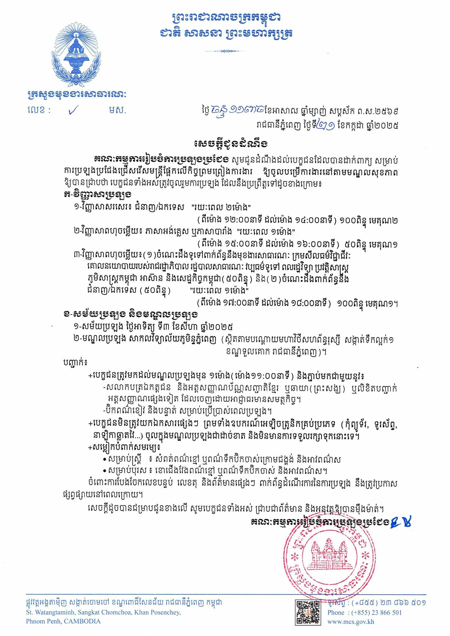 ក្រសួងមុខងារសាធារណៈ ជាគណៈកម្មការរៀបចំការប្រឡងប្រជែង សូមជូនដំណឹងដល់បេក្ខជនដែលបានដាក់ពាក្យ សម្រាប់ ការប្រឡងប្រជែងជ្រើសរើសមន្ត្រីផ្អែកលើកិច្ចព្រមព្រៀងការងារ ឱ្យចូលបម្រើការងារនៅតាមមណ្ឌលសុខភាព ឱ្យបានជ្រាបថា បេក្ខជនទាំងអស់ត្រូវចូលរួមការប្រឡង ដែលនឹងប្រព្រឹត្តទៅដូចខាងក្រោម៖