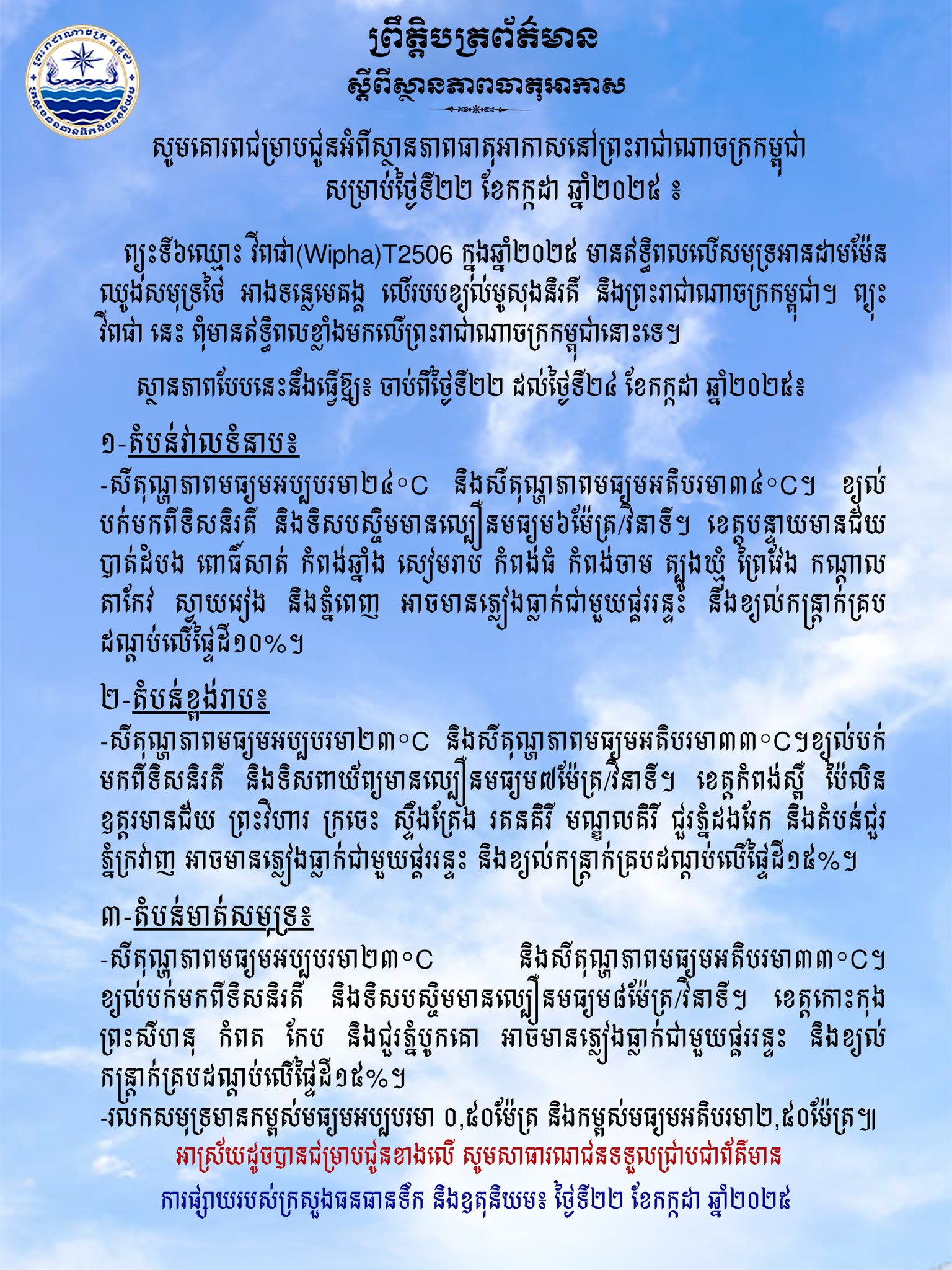 (រាជធានីភ្នំពេញ)៖ តាមមការចុះផ្សាយរបស់ ក្រសួងធនធានទឹក និងឧតុនិយម បានឱ្យដឹង នៅព្រឹកថ្ងៃទី ២២ ខែកក្កដា ឆ្នាំ ២០២៥ នេះ ថា ប្រទេសកម្ពុជា ទទួលរងឥទ្ធិពលតិចតួចពី ព្យុះទី ៦ ឈ្មោះ ‹‹វីពជា›› ដែលអាចបណ្ដាលឱ្យមាន ភ្លៀងធ្លាក់ ផ្គររន្ទះ និងខ្យល់កន្ត្រាក់ ជាពិសេសតំបន់សមុទ្រ។