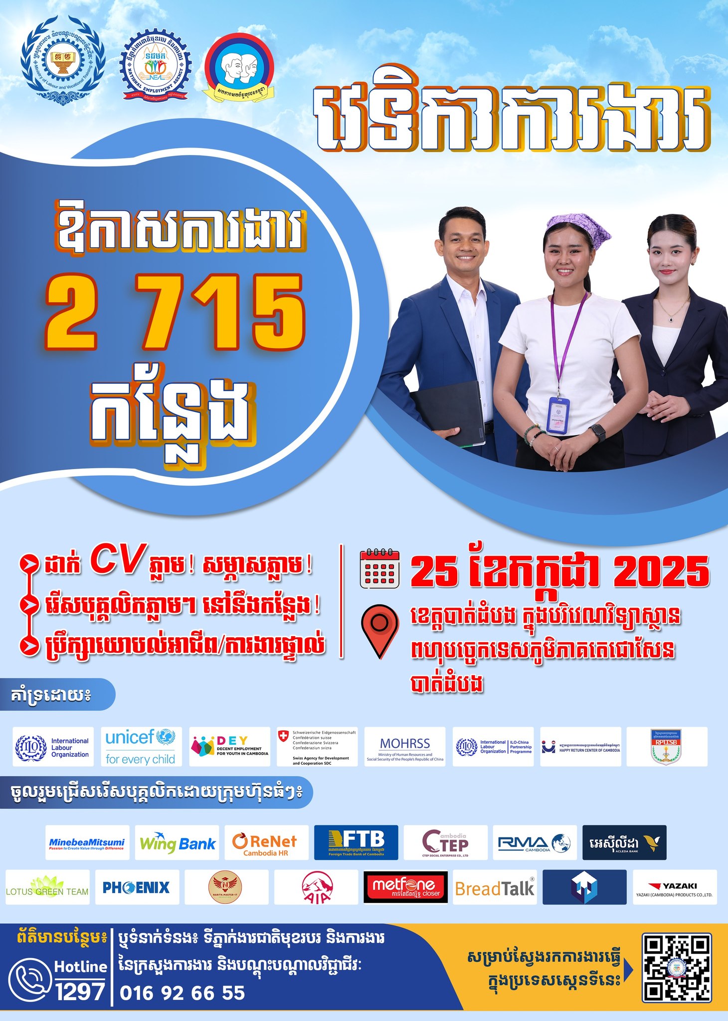 (ខេត្តបាត់ដំបង)៖ ទីភ្នាក់ងារជាតិមុខរបរ និងការងារ បានឱ្យដឹងពី ឱកាសការងារសរុបជិត ៣ពាន់កន្លែង មួយក្រុមហ៊ុនធំៗចំនួន ១៥ នៅក្នុង ‹‹វេទិកាការងារ›› ក្នុងបរិវេណវិទ្យាស្ថានពហុបច្ចេកទេសភូមិភាគតេជោសែន ខេត្តបាត់ដំបង នៅថ្ងៃទី ២៥ ខែកក្កដា ឆ្នាំ ២០២៥ ខាងមុខនេះ។