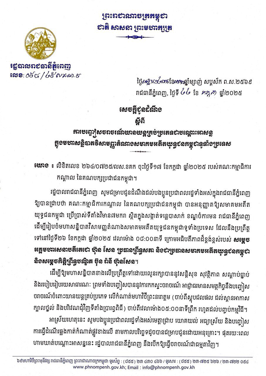ក្នុងនោះ រដ្ឋបាលរាជធានីភ្នំពេញ បានបញ្ជាក់់ថា គណៈកម្មាធិការកណ្តាល នៃគណបក្សប្រជាជនកម្ពុជា បានអនុញ្ញាតឱ្យសមាគមអតីត យុទ្ធជនកម្ពុជា ប្រើប្រាស់ទីតាំងវិមាន៧មករា ស្ថិតក្នុងសង្កាត់ទន្លេបាសាក់ ខណ្ឌចំការមន រាជធានីភ្នំពេញ ដើម្បីរៀបចំមហាសន្និបាតវិសាមញ្ញតំណាងសមាគមអតីតយុទ្ធជនកម្ពុជាទូទាំងប្រទេស ដែលនឹងប្រព្រឹត្ត ទៅនៅថ្ងៃទី ២៦ ខែកក្កដា ឆ្នាំ ២០២៥ វេលាម៉ោង ០៨:០០នាទី ក្រោមអធិបតីភាពដ៏ខ្ពង់ខ្ពស់របស់ សម្តេចអគ្គមហាសេនាបតីតេជោ ហ៊ុន សែន ប្រធានព្រឹទ្ធសភា និងជាប្រធានសមាគមអតីតយុទ្ធជនកម្ពុជា និងសម្តេចកិត្តិព្រឹទ្ធបណ្ឌិត ប៊ុន រ៉ានី ហ៊ុនសែន។