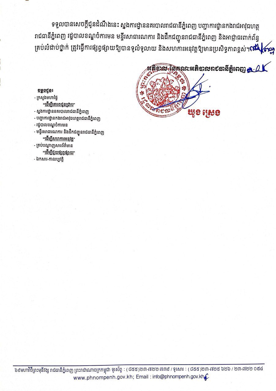 អាស្រ័យហេតុនេះ សូមបងប្អូនប្រជាពលរដ្ឋទាំងអស់មេត្តាជ្រាប យោគយល់ អធ្យាស្រ័យ និងបញ្ចៀស ការធ្វើដំណើរឆ្លងកាត់កំណាត់ផ្លូវខាងលើ តាមកាលបរិច្ឆេទដូចបានជម្រាបជូនដោយអនុគ្រោះ។ ផុតរយៈពេល ហាមឃាត់បណ្តោះអាសន្ននេះ រដ្ឋបាលរាជធានីភ្នំពេញ នឹងបើកឱ្យធ្វើចរាចរណ៍ជាធម្មតាវិញ៕