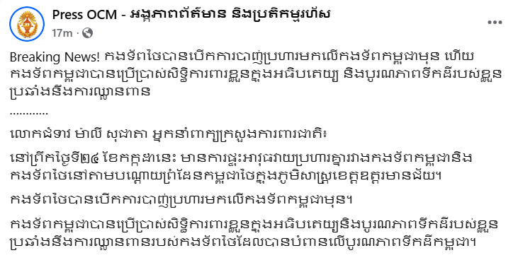 (ខេត្តឧត្តរមានជ័យ)៖ យោងតាមការចុះផ្សាយរបស់ អង្គភាពព័ត៌មាន និងប្រតិកម្មរហ័ស នៅព្រឹកថ្ងៃទី ២៤ ខែកក្កដា ឆ្នាំ ២០២៥ នេះ កងទ័ពថៃបានបើកការបាញ់ប្រហារមកលើកងទ័ពកម្ពុជាមុន ហើយកងទ័ពកម្ពុជាបានប្រើប្រាស់សិទ្ធិការពារខ្លួនក្នុងអធិបតេយ្យ និងបូរណភាពទឹកដីរបស់ខ្លួនប្រឆាំងនឹងការឈ្លានពាន។