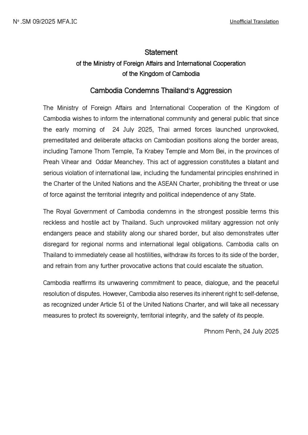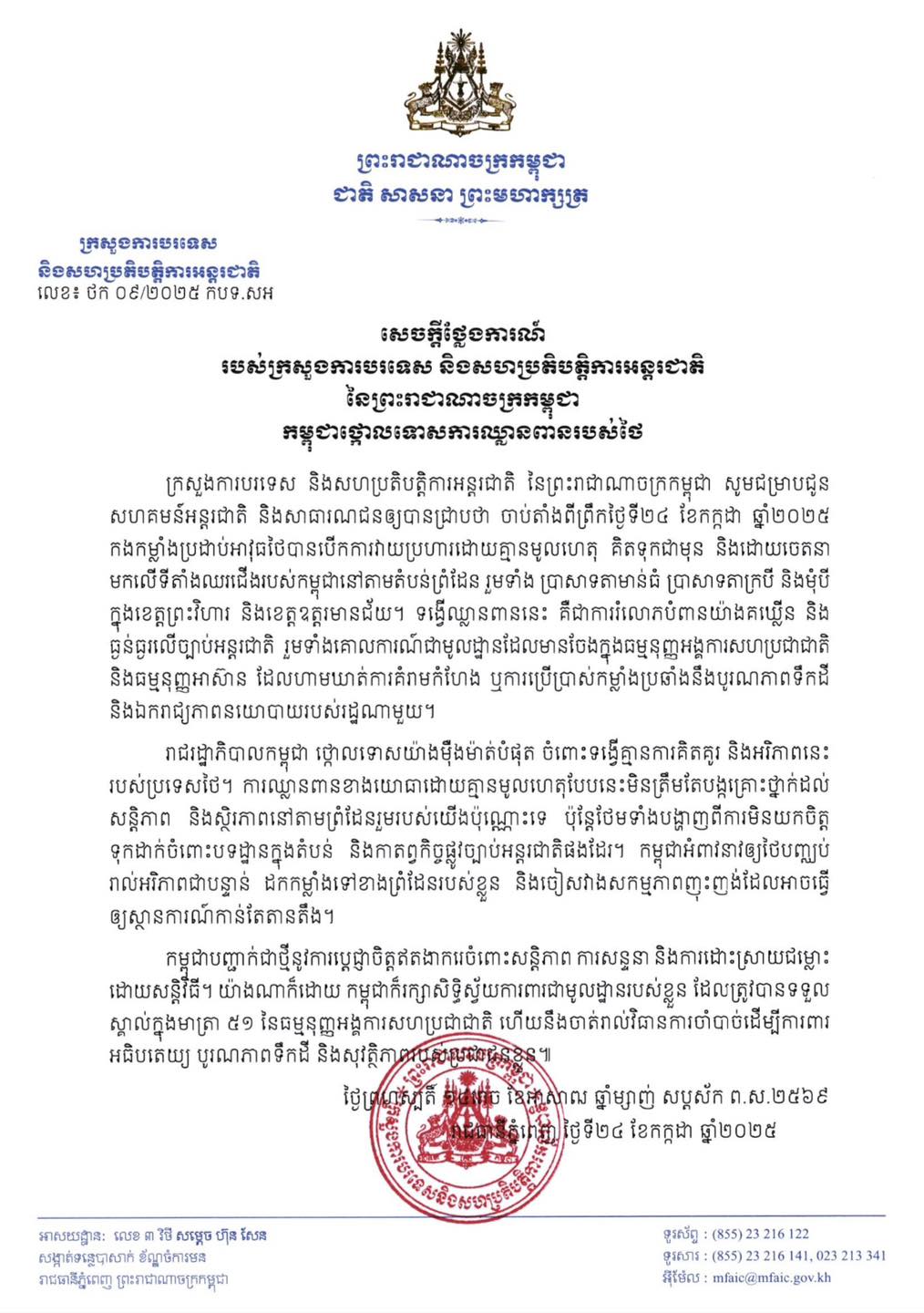 នៅថ្ងៃទី ២៤ ខែកក្កដា ឆ្នាំ ២០២៥ នេះ បានឱ្យដឹងថា ក្រសួងការបរទេស និងសហប្រតិបត្តិការអន្តរជាតិ នៃព្រះរាជាណាចក្រកម្ពុជា ជម្រាបជូន សហគមន៍អន្តរជាតិ និងសាធារណជនឲ្យបានជ្រាបថា ចាប់តាំងពីព្រឹកថ្ងៃទី២៤ ខែកក្កដា ឆ្នាំ២០២៥ កងកម្លាំងប្រដាប់អាវុធថៃបានបើកការវាយប្រហារដោយគ្មានមូលហេតុ គិតទុកជាមុន និងដោយចេតនា មកលើទីតាំងឈរជើងរបស់កម្ពុជានៅតាមតំបន់ព្រំដែន រួមទាំង ប្រាសាទតាមាន់ធំ ប្រាសាទតាក្របី និងមុំបី ក្នុងខេត្តព្រះវិហារ និងខេត្តឧត្តរមានជ័យ។ ទង្វើឈ្លានពាននេះ គឺជាការរំលោភបំពានយ៉ាងគឃ្លីន និង ធ្ងន់ធ្ងរលើច្បាប់អន្តរជាតិ រួមទាំងគោលការណ៍ជាមូលដ្ឋានដែលមានចែងក្នុងធម្មនុញ្ញអង្គការសហប្រជាជាតិ និងធម្មនុញ្ញអាស៊ាន ដែលហាមឃាត់ការគំរាមកំហែង ឬការប្រើប្រាស់កម្លាំងប្រឆាំងនឹងបូរណភាពទឹកដី និងឯករាជ្យភាពនយោបាយរបស់រដ្ឋណាមួយ។