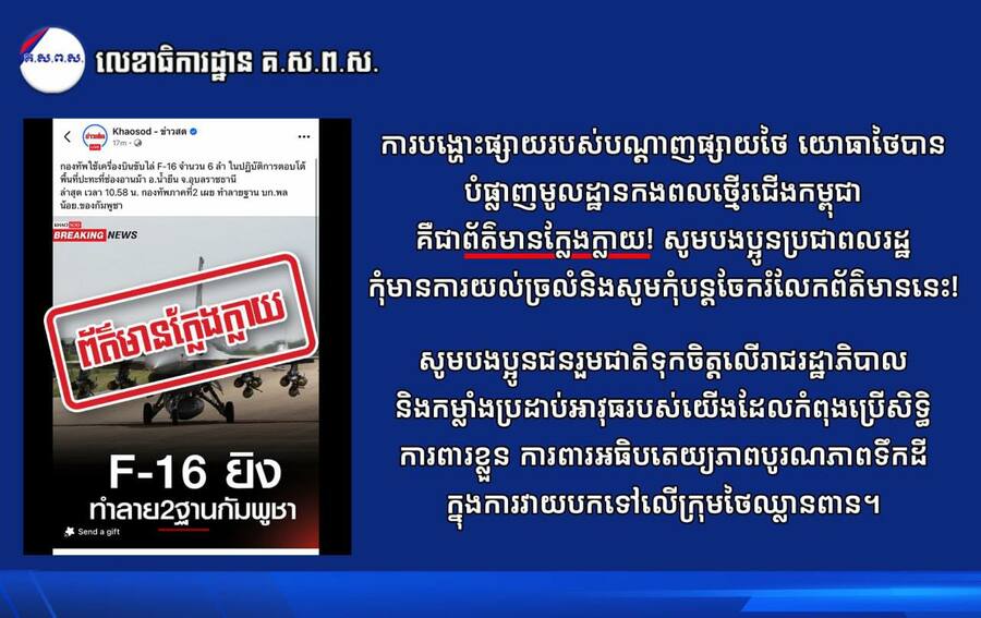 (រាជធានីភ្នំពេញ)៖ យោងតាមការចុះផ្សាយរបស់ ក្រសួងព័ត៌មាន នៅរសៀលថ្ងៃទី ២៤ ខែកក្កដា ឆ្នាំ ២០២៥ នេះ បានឱ្យដឹងថា ការបង្ហោះផ្សាយរបស់បណ្ដាញផ្សាយថៃ យោធាថៃបានបំផ្លាញមូលដ្ឋានកងពលថ្មើរជើងកម្ពុជា គឺជាព័ត៌មានក្លែងក្លាយ។