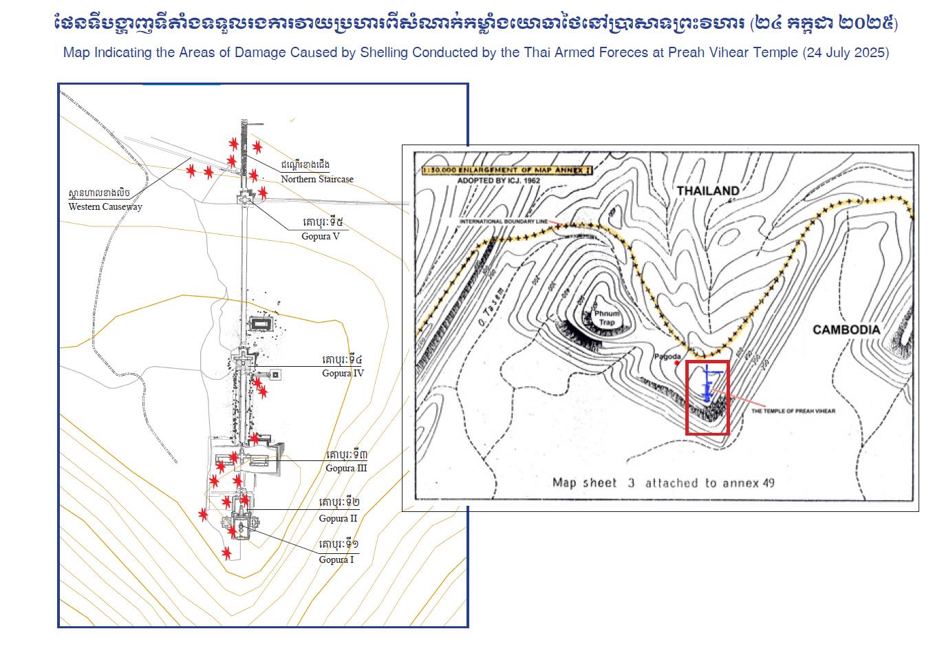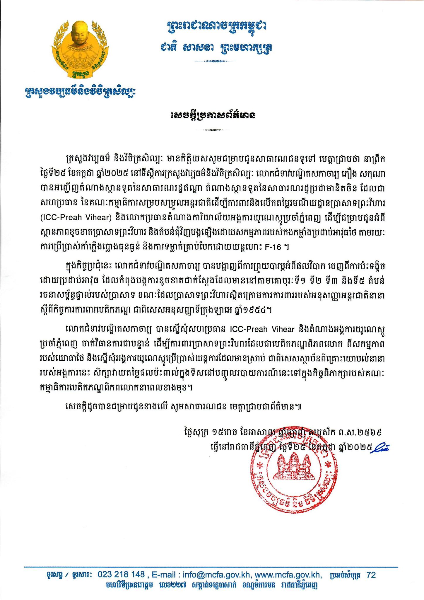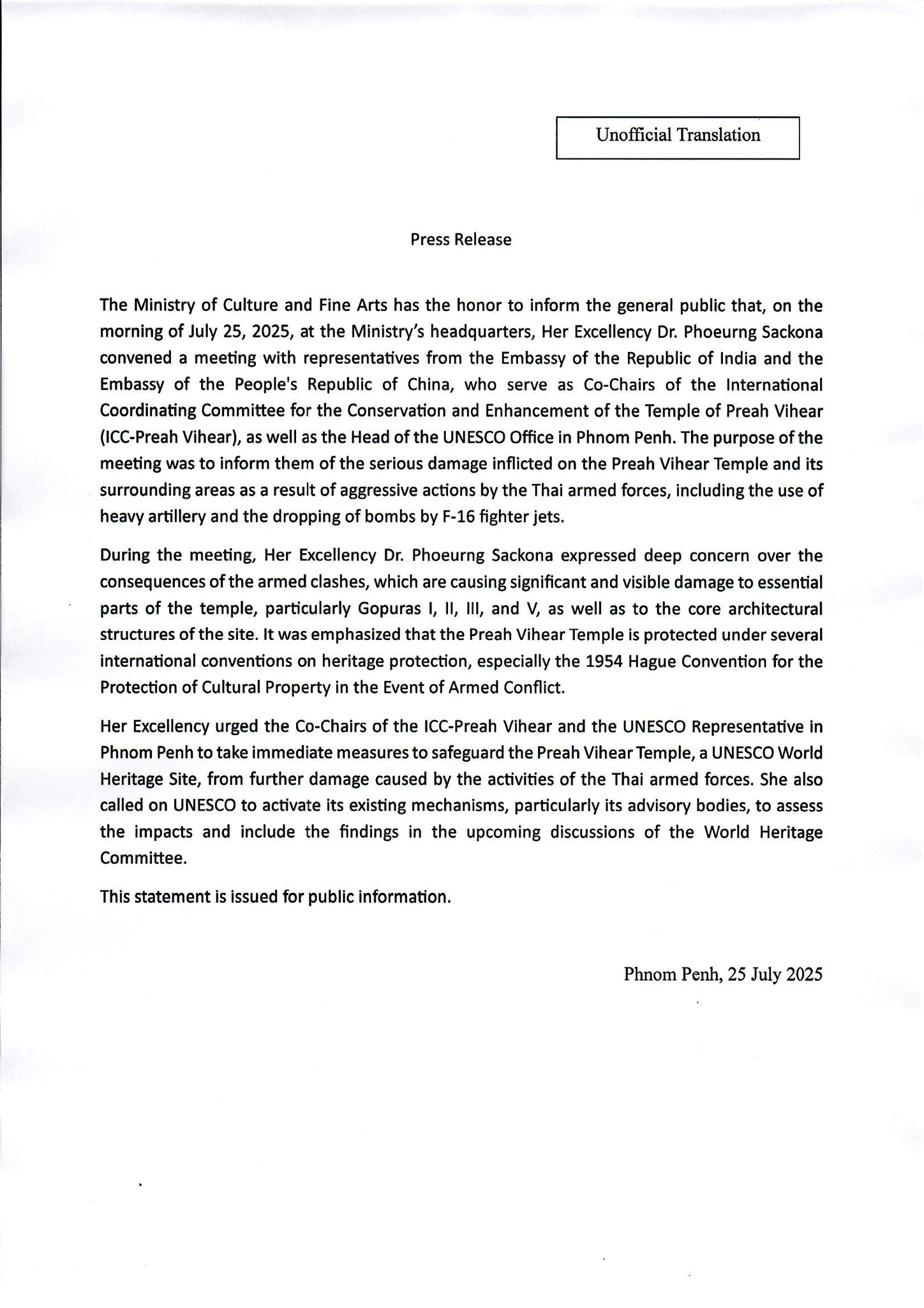 ក្នុងសេចក្ដីប្រកាសព័ត៌មានរបស់ ក្រសួងវប្បធម៌ និងវិចិត្រសិល្បៈ នាព្រឹកថ្ងៃទី ២៥ ខែកក្កដា ឆ្នាំ ២០២៥ នៅទីស្តីការក្រសួងវប្បធម៌និងវិចិត្រសិល្បៈ លោកជំទាវបណ្ឌិតសភាចារ្យ ភឿង សកុណា បានអញ្ជើញតំណាងស្ថានទូតនៃសាធារណរដ្ឋឥណ្ឌា តំណាងស្ថានទូតនៃសាធារណរដ្ឋប្រជាមានិតចិន ដែលជា សហប្រធាន នៃគណៈកម្មាធិការសម្របសម្រួលអន្តរជាតិដើម្បីការពារនិងលើកតម្លៃរមណីយដ្ឋានប្រាសាទព្រះវិហារ (ICC-Preah Vihear) និងលោកប្រធានតំណាងការិយាល័យអង្គការយូណេស្កូប្រចាំភ្នំពេញ ដើម្បីជម្រាបជូនអំពី ស្ថានភាពខូចខាតប្រាសាទព្រះវិហារ និងតំបន់ជុំវិញបង្កឡើងដោយសកម្មភាពរបស់កងកម្លាំងប្រដាប់អាវុធថៃ តាមរយៈ ការប្រើប្រាស់កាំភ្លើងខ្លោងធុនធ្ងន់ និងការទម្លាក់គ្រាប់បែកដោយយន្តហោះ F-16 ។