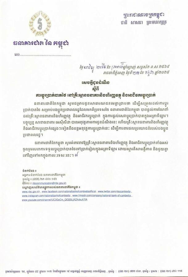 នៅថ្ងៃទី២៧ ខែកក្កដា ឆ្នាំ២០២៥ យោងតាមការចុះផ្សាយរបស់ ក្រសួងព័ត៌មាន បានឱ្យដឹងថា ធនាគារជាតិ បានចេញ សេចក្តីជូនដំណឹង ស្តីពី “ការប្ដូរប្រាក់បាតថៃ នៅគ្រឹះស្ថានធនាគារនិងហិរញ្ញវត្ថុ និងអាជីវករប្តូរប្រាក់”។