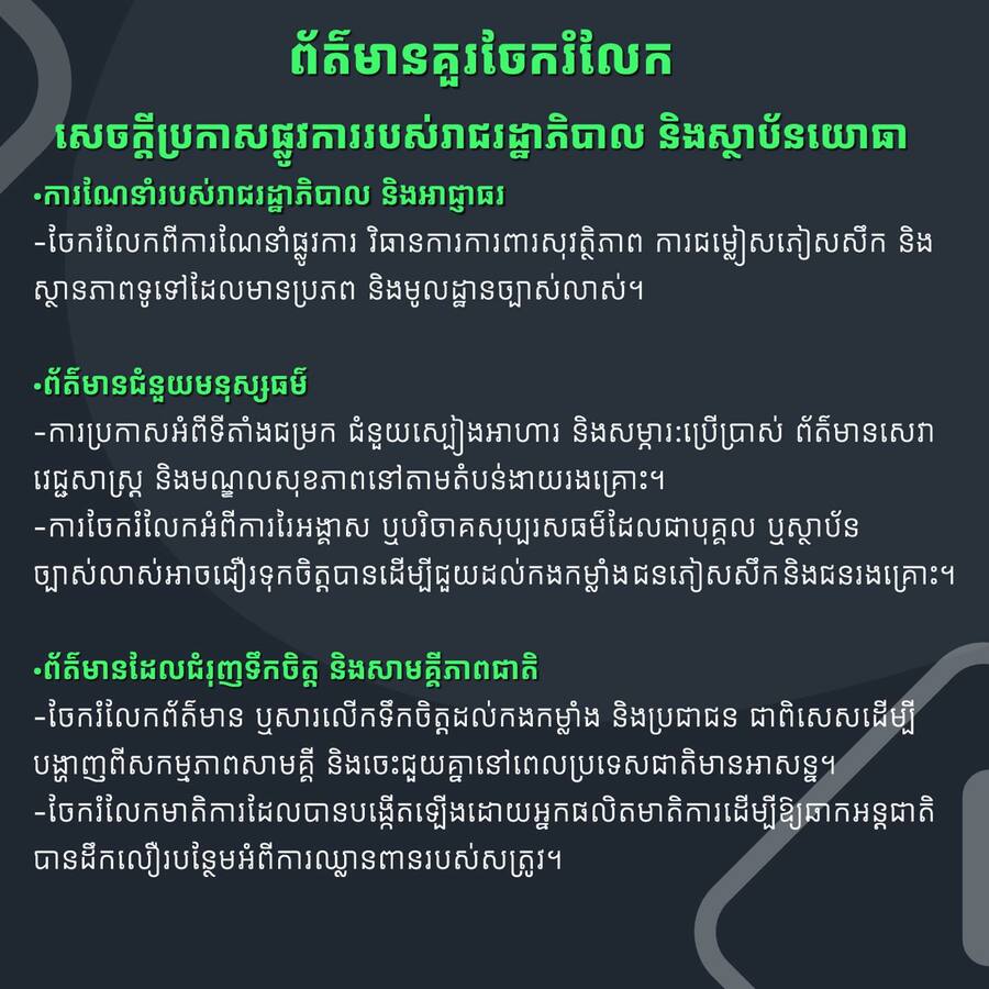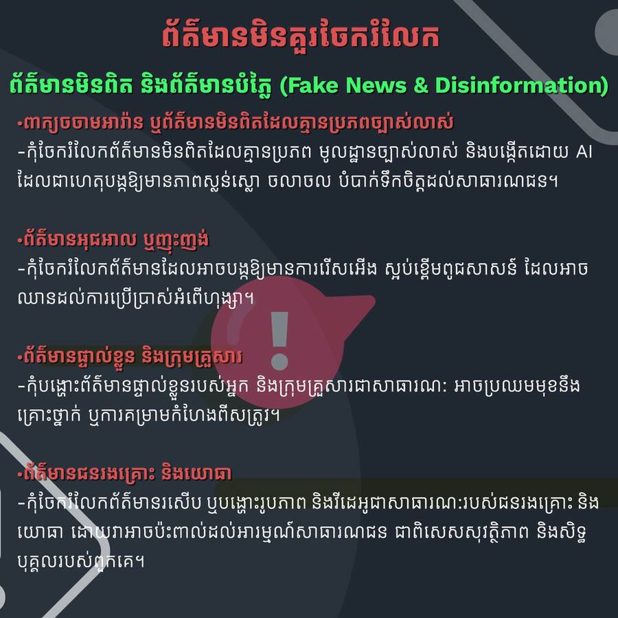 (រាជធានីភ្នំពេញ)៖ យោងតាមការចុះផ្សាយពី ក្រសួងព័ត៌មាន នៅថ្ងៃទី ៤ ខែសីហា ឆ្នាំ ២០២៥ នេះ នាយកដ្ឋានប្រឆាំងបទល្មើសបច្ចេកវិទ្យា ណែនាំពីព័ត៌មាន ដែលគួរចែករំលែក និងមិនគួរចែករំលែក ក្នុងអំឡុងសង្គ្រាមឈ្លានពានរបស់ថៃតាមព្រំដែនកម្ពុជា-ថៃ។