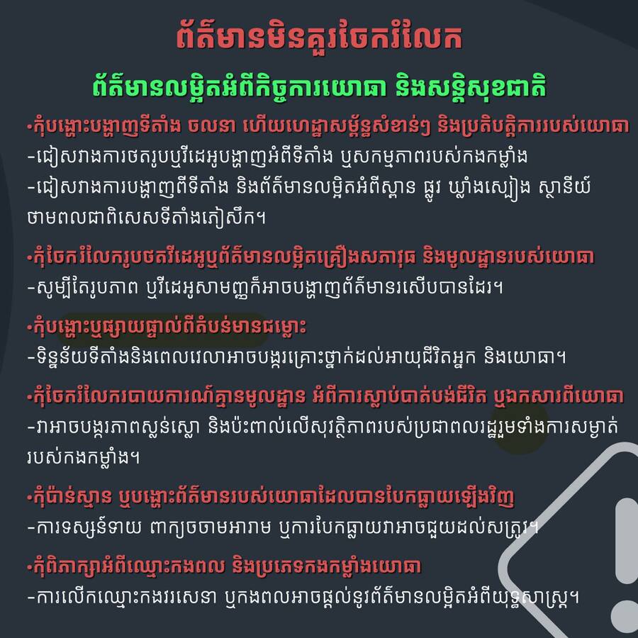 •កុំប៉ាន់ស្មាន ឬបង្ហោះព័ត៌មានរបស់យោធាដែលបានបែកធ្លាយឡើងវិញ