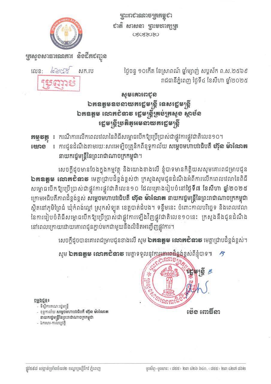 (រាជធានីភ្នំពេញ)៖ ក្រសួងសាធារណការ និងដឹកជញ្ជូន នៅថ្ងៃទី ៥ ខែសីហា ឆ្នាំ ២០២៥ នេះ បានចេញសេចក្ដីជូនដំណឹង ការលើកពេលវេលានៃពិធីសម្ពោធបើកឱ្យប្រើប្រាស់ជាផ្លូវការផ្លូវជាតិលេខ១០ ដែលគ្រោងនឹងរៀបចំនៅថ្ងៃទី ៧ ខែសីហា ឆ្នាំ ២០២៥ ខាងមុខនេះ។