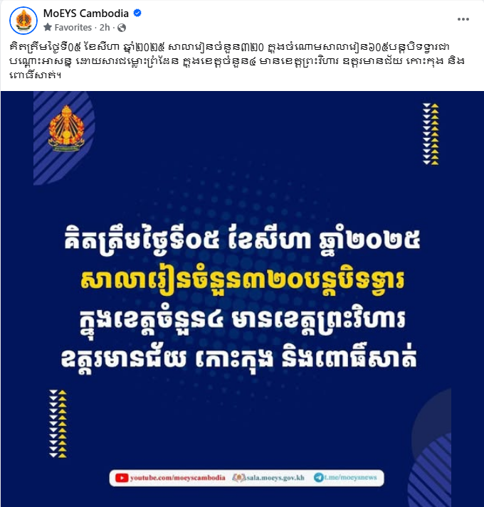 គិតត្រឹមថ្ងៃទី ៥ ខែសីហានេះ សាលារៀន ៣២០ កន្លែង ក្នុងខេត្តចំនួន ៤ បានបន្តបិទជាបណ្ដោះអាសន្ន ដោយសារជម្លោះព្រំដែនកម្ពុជា-ថៃ