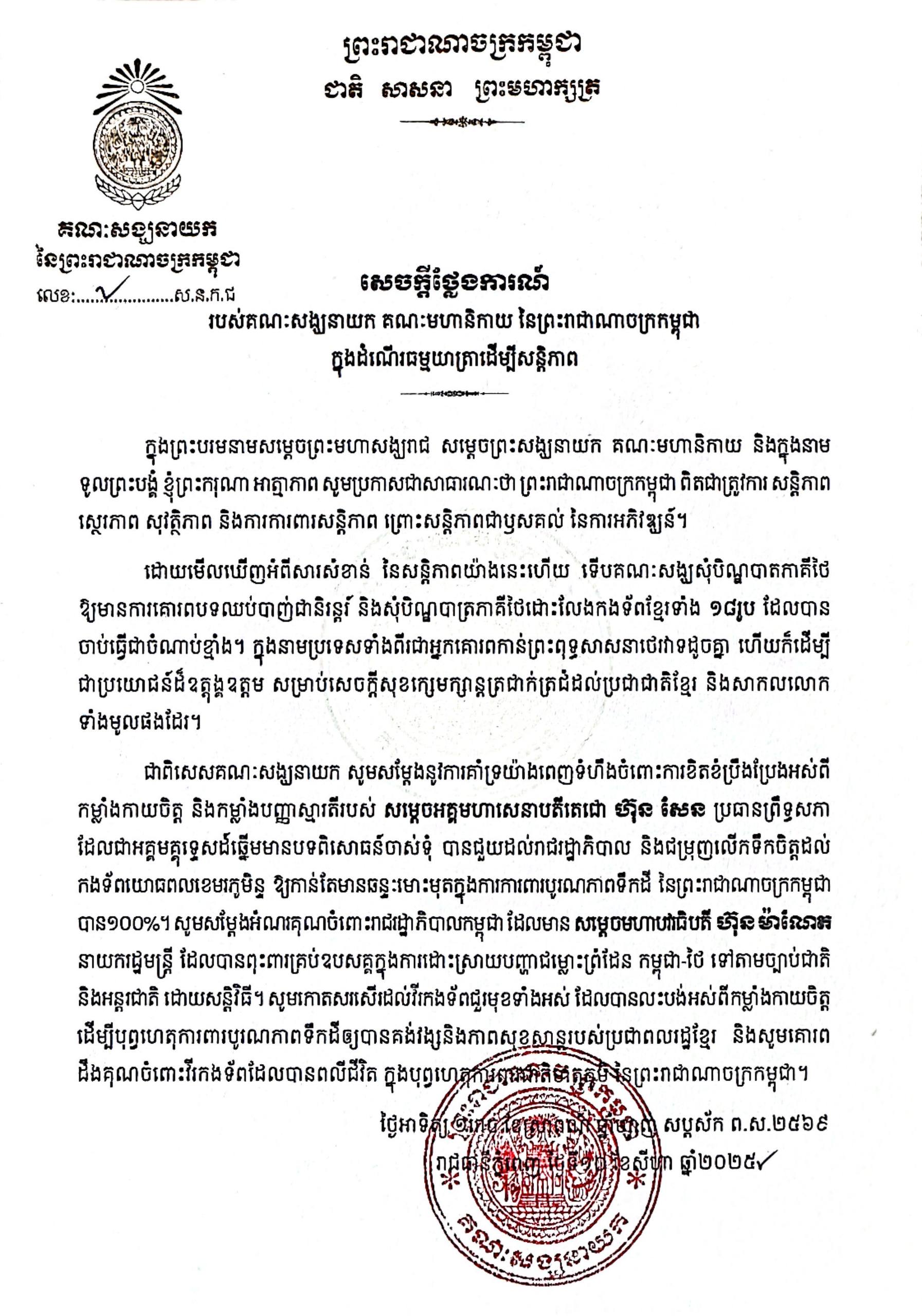 (រាជធានីភ្នំពេញ)៖ តាមការការចុះផ្សាយរបស់ ឯកសារមន្ត្រីសាធរណៈ នៅព្រឺកថ្ងៃទី ១១ ខែសីហា ឆ្នាំ ២០២៥ នេះ បានឱ្យដឹងថា គណៈសង្ឃកម្ពុជាសុំបិណ្ឌបាតភាគីថៃ ឱ្យមានការគោរពបទឈប់បាញ់ជានិរន្តរ៍ និងសុំបិណ្ឌបាត្រភាគីថៃដោះលែងកងទ័ពខ្មែរទាំង ១៨រូប ដែលត្រូវបានចាប់ធ្វើជាចំណាប់ខ្មាំង។