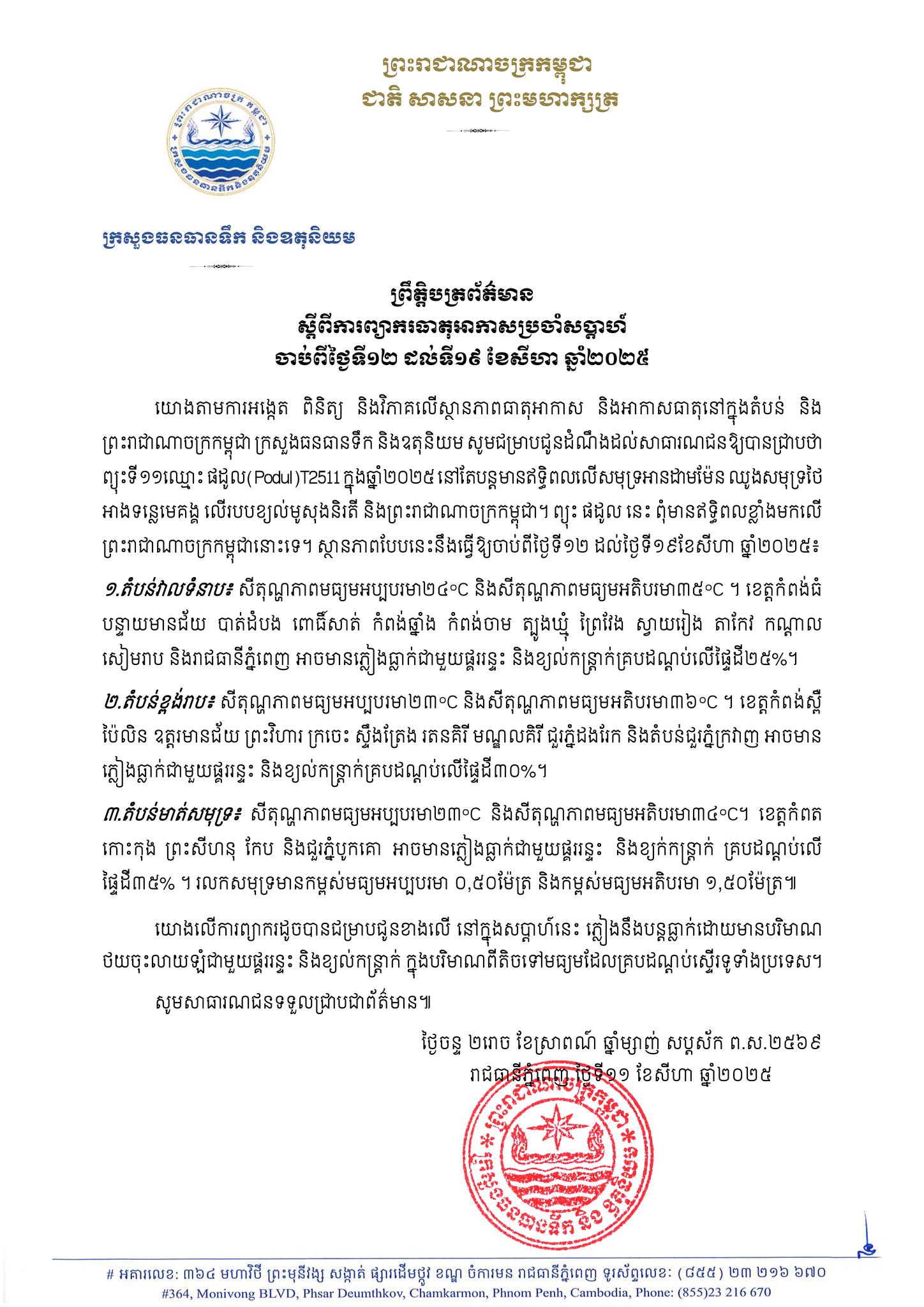 (រាជធានីភ្នំពេញ)៖ នៅរសៀលថ្ងៃទី ១១ ខែសីហា ឆ្នាំ ២០២៥ នេះ ក្រសួងធនធានទឹក និងឧតុនិយម បានបញ្ជាក់ថាតាម ការព្យាការណ៏ធាតុអាកាសប្រចាំសប្តាហ៍ ចាប់ពីថ្ងៃទី ១២ ដល់ថ្ងៃទី ១៩ ខែសីហា ឆ្នាំ ២០២៥ នឹងមានភ្លៀងបន្តធ្លាក់ស្ទើរទូទាំងប្រទេស។