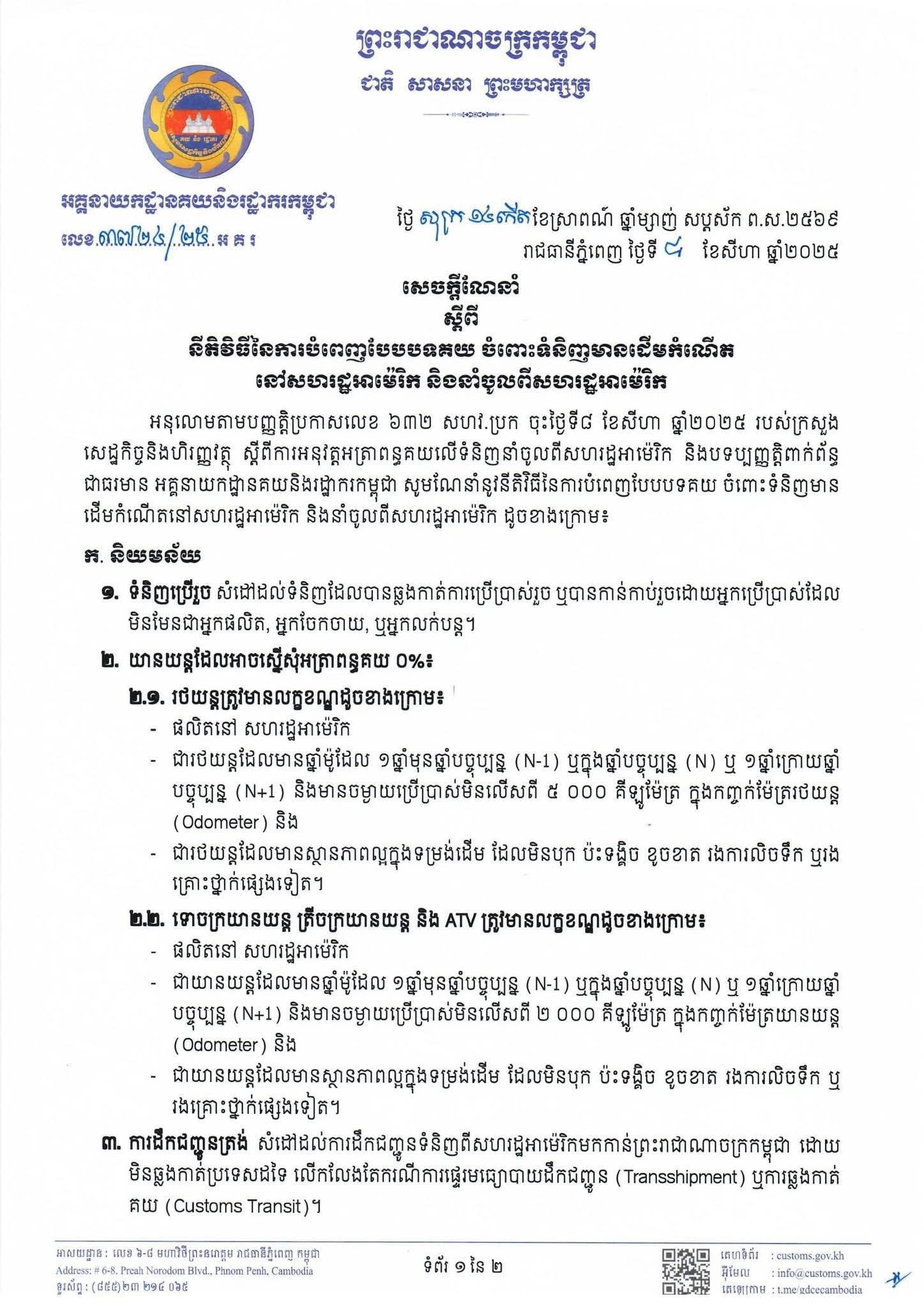 (រាជធានីភ្នំពេញ)៖ នៅព្រឹកថ្ងៃទី ១២ ខែសីហា ឆ្នាំ ២០២៥ នេះ តាមការចុះផ្សាយពី ឯកសារមន្ត្រីសាធារណៈ បានឱ្យដឹងថា អគ្គនាយកដ្ឋានគយនិងរដ្ឋាករកម្ពុជា បានចេញសេចក្តីណែនាំពី នីតិវិធីនៃការបំពេញបែបបទគយ ចំពោះទំនិញមានដើមកំណើត នៅសហរដ្ឋអាម៉េរិក និងនាំចូលពីសហរដ្ឋអាម៉េរិក។