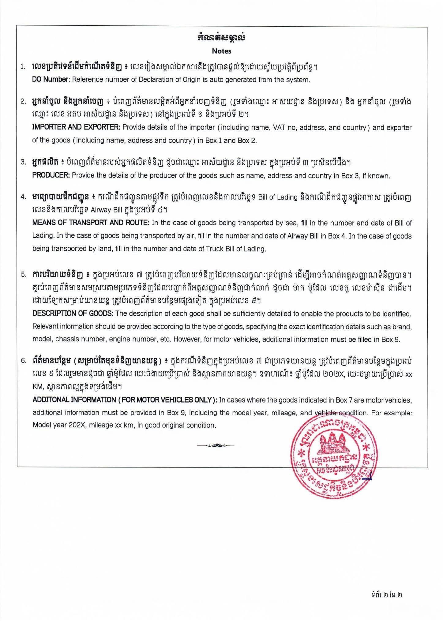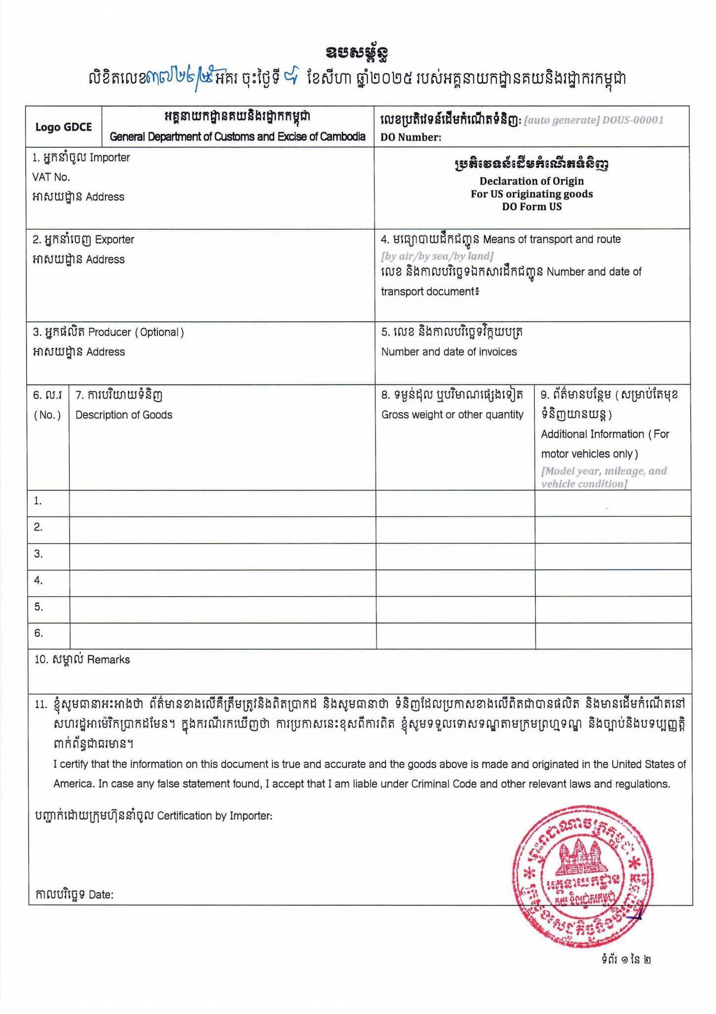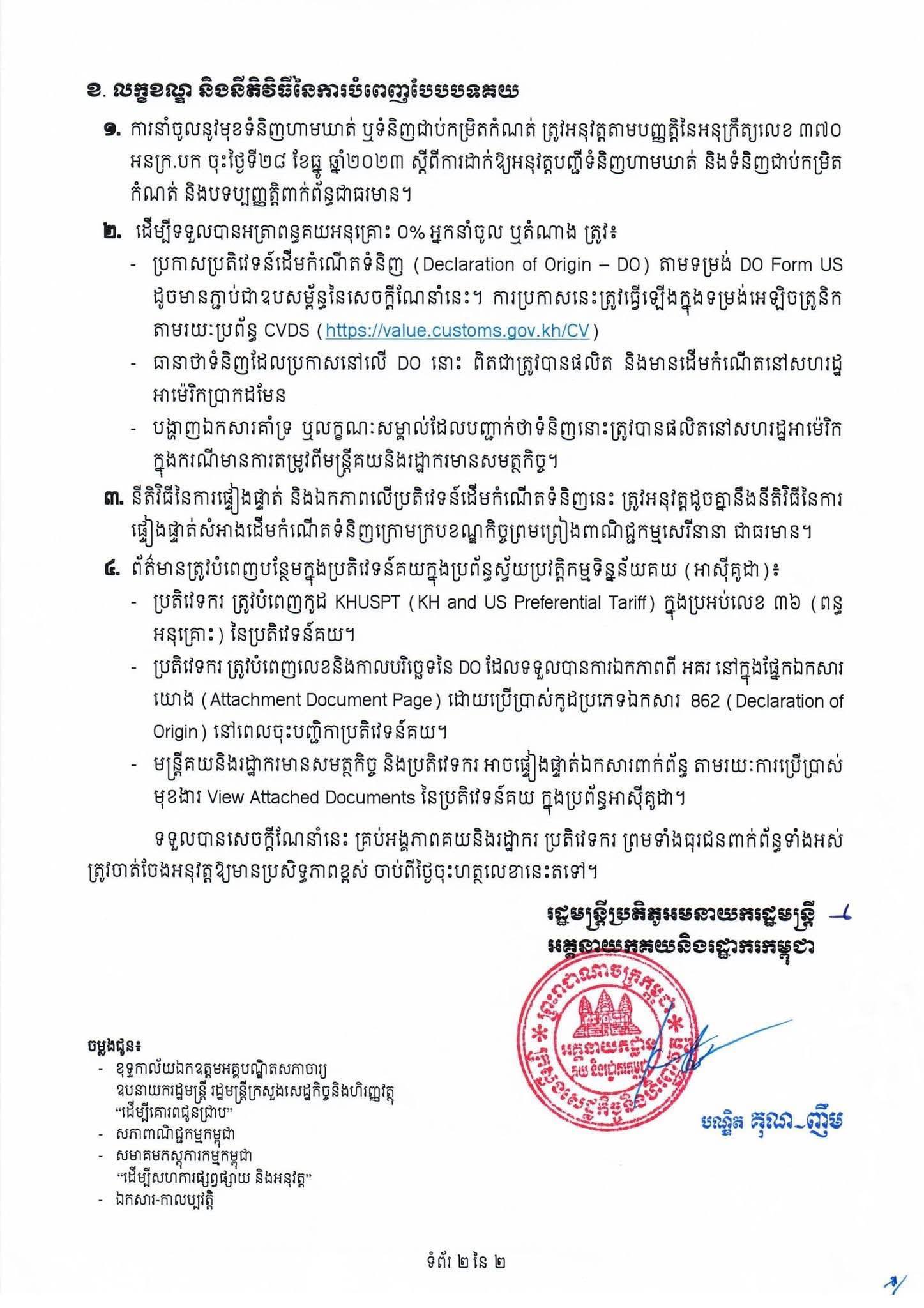 -ប្រកាសប្រតិវេទន៍ដើមកំណើតទំនិញ (Declaration of Origin – DO) តាមទម្រង់ DO Form US ដូចមានភ្ជាប់ជាឧបសម្ព័ន្ធនៃសេចក្តីណែនាំនេះ។ ការប្រកាសនេះត្រូវធ្វើឡើងក្នុងទម្រង់អេឡិចត្រូនិក តាមរយៈប្រព័ន្ធ CVDS (https://value.customs.gov.kh/CV)