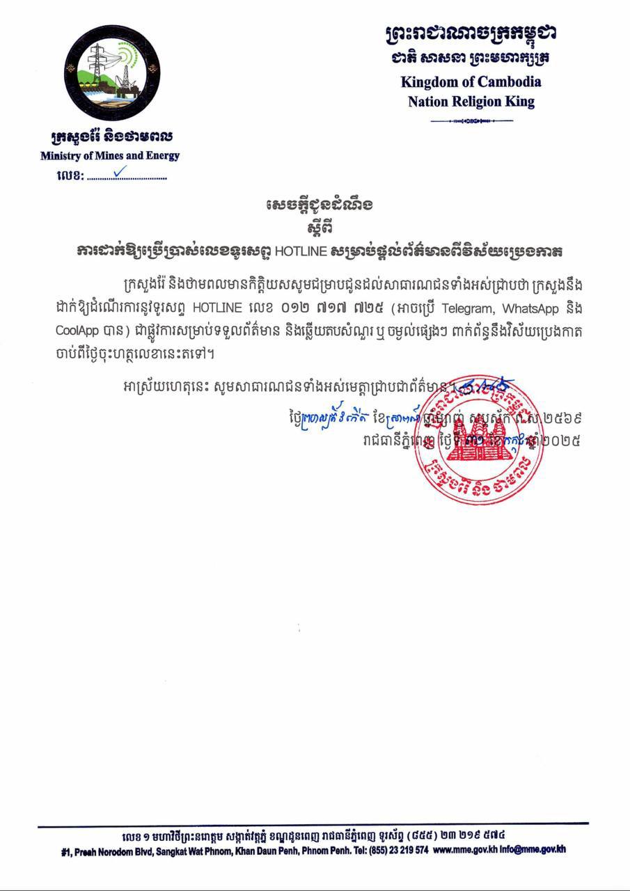 តាមរយៈសេចក្តីជូនដំណឹងរបស់ ក្រសួងរ៉ែ និងថាមពល បានបញ្ជាក់ថា ការដាក់ឱ្យដំណើរការនូវទូរសព្ទ HOTLINE លេខ ០១២ ៧១៧ ៧២៥ (អាចប្រើ Telegram, WhatsApp និង CoolApp បាន) ជាផ្លូវការសម្រាប់ទទួលព័ត៌មាន និងឆ្លើយតបសំណួរ ឬ ចម្ងល់ផ្សេងៗ ពាក់ព័ន្ធនឹងវិស័យប្រេងកាត ចាប់ពីថ្ងៃចុះហត្ថលេខានេះតទៅ៕