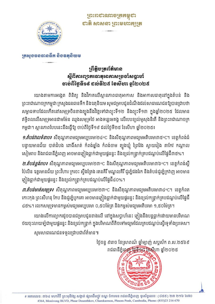 ក្នុងនោះ ក្រសួងធនធានទឹក និងឧតុនិយម បានបន្ថែមថា យោងតាមការអង្កេត ពិនិត្យ និងវិភាគលើស្ថានភាពធាតុអាកាស និងអាកាសធាតុនៅក្នុងតំបន់ និង ព្រះរាជាណាចក្រកម្ពុជា ក្រសួងធនធានទឹក និងឧតុនិយម សូមជម្រាបជូនដំណឹងដល់សាធារណជនឱ្យបានជ្រាបថា សម្ពាធទាបដែលកើតនៅសមុទ្រចិនខាងត្បូងនឹងវិវត្តទៅជាព្យុះទី១២ និងព្យុះទី១៣ ក្នុងឆ្នាំ២០២៥ ដែលមាន ឥទ្ធិពលលើសមុទ្រអានដាមម៉ែន ឈូងសមុទ្រថៃ អាងទន្លេមេគង្គ លើរបបខ្យល់មូសុងនិរតី និងព្រះរាជាណាចក្រ កម្ពុជា។ ស្ថានភាពបែបនេះនឹងធ្វើឱ្យ ចាប់ពីថ្ងៃទី១៩ ដល់ថ្ងៃទី២៥ ខែសីហា ឆ្នាំ២០២៥៖