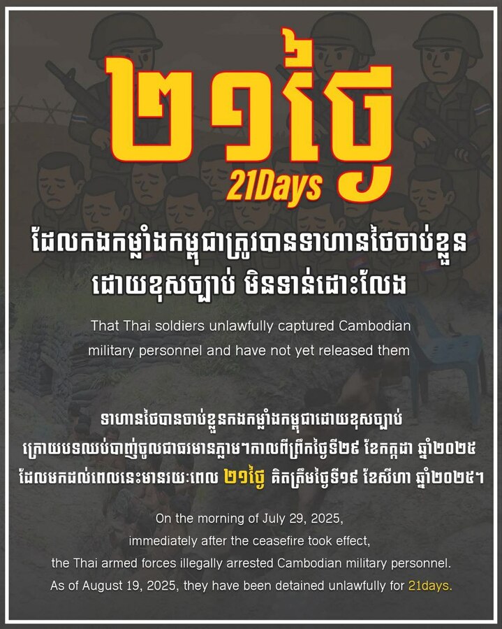 គួរបញ្ជាក់ថា ទាហានថៃបានចូលមកចាប់ខ្លួនកងកម្លាំងកម្ពុជាដោយខុសច្បាប់ ក្រោយបទឈប់បាញ់ចូលជាធរមានភ្លាមៗនៅថ្ងៃទី២៩ ខែកក្កដា ឆ្នាំ ២០២៥។គិតមកដល់ពេលនេះមានរយៈពេល២០ថ្ងៃ ២៣ម៉ោង និង ១០នាទីគិតត្រឹមម៉ោង៧,០០នាទីព្រឹកថ្ងៃទី១៩ ខែ សីហា ឆ្នាំ២០២៥នេះ។ក្រសួងការពារជាតិ កងទ័ពកម្ពុជា និងសហគមន៍អន្តរជាតិបន្តការទាមទារ រហូតដល់ថៃបំពេញកាតព្វកិច្ចរបស់ខ្លួនដោយព្រមប្រគល់មកវិញនូវកងកម្លាំងកម្ពុជាទាំង១៨រូបមកវិញក្រោមច្បាប់អន្តរជាតិ។ហើយយើងមិនទុកឱ្យសមាជិកក្រុមគ្រួសារយើងណាម្នាក់ចោលដោយឯកកោនោះទេ។