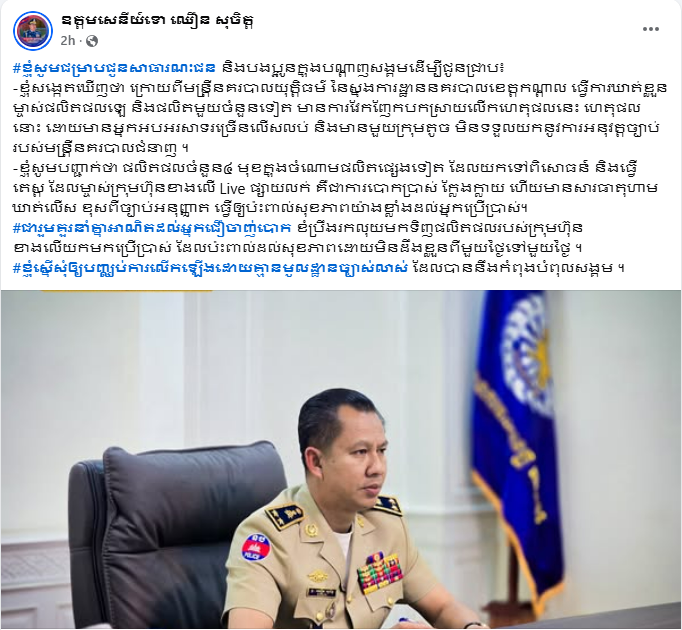 ក្នុងការបង្ហោះលើផេកផ្លូវការរបស់ ឧត្តមសេនីយ៍ទោ ឈឿន សុចិត្ត ស្នងការនគរបាលខេត្តកណ្ដាល បានឱ្យដឹងថា៖ «ខ្ញុំសង្កេតឃើញថា ក្រោយពីមន្រ្តីនគរបាលយុត្តិធម៌ នៃស្នងការដ្ឋាននគរបាលខេត្តកណ្តាល ធ្វើការឃាត់ខ្លួនម្ចាស់ផលិតផលឡេ និងផលិតមួយចំនួនទៀត មានការវែកញែកបកស្រាយលើកហេតុផលនេះ ហេតុផលនោះ ដោយមានអ្នកអបអរសាទរច្រើនលើសលប់ និងមានមួយក្រុមតូច មិនទទួលយកនូវការអនុវត្តច្បាប់របស់មន្រ្តីនគរបាលជំនាញ»។