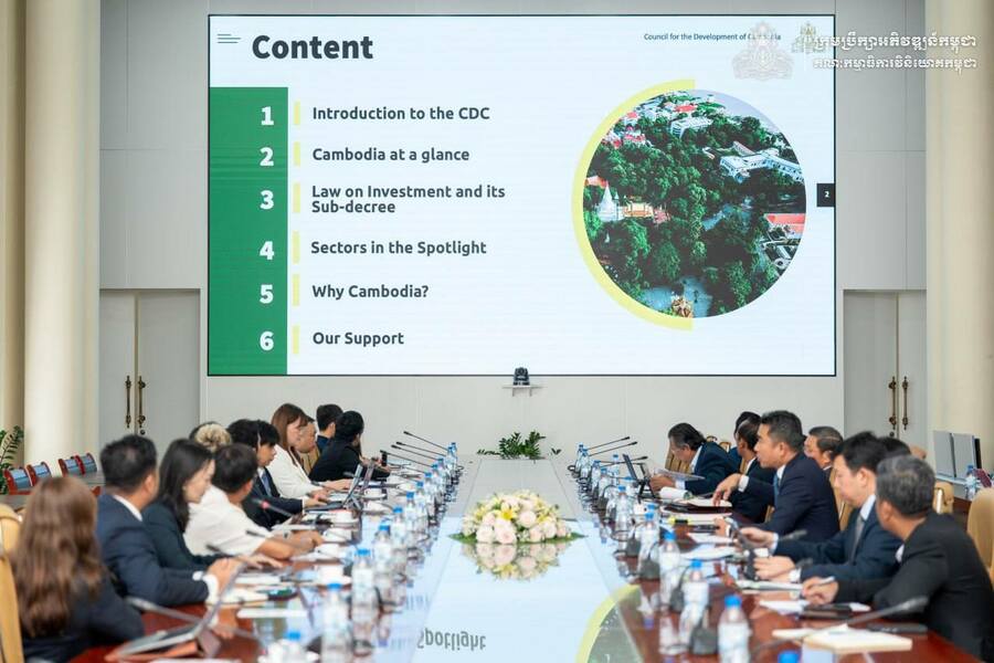 ជំនួបដែលបានធ្វើឡើងនាថ្ងៃទី១៩ ខែសីហា ឆ្នាំ២០២៥ម្សិលមិញនេះ ឯកឧត្តមអគ្គលេខាធិការរង បានសង្ខេបអំពីតួនាទីរបស់ស្ថាប័នក្រុមប្រឹក្សាអភិវឌ្ឍន៍កម្ពុជា, បរិយាកាសវិនិយោគ, ការលើកទឹកចិត្តទាំងផ្នែកសារពើពន្ធ និងមិនមែនសារពើពន្ធ, ការធានាវិនិយោគក្រោមក្របខណ្ឌច្បាប់វិនិយោគ, កត្តាអំណោយផលនៃសុខសន្តិភាព, ស្ថិរភាពម៉ាក្រូសេដ្ឋកិច្ច, វិស័យអាទិភាព និងភាពលេចធ្លោនៃហេដ្ឋារចនាសម្ព័ន្ធរូបវន្តរបស់កម្ពុជាដែលកំពុងរីកដុះដាលជាបន្តបន្ទាប់។
