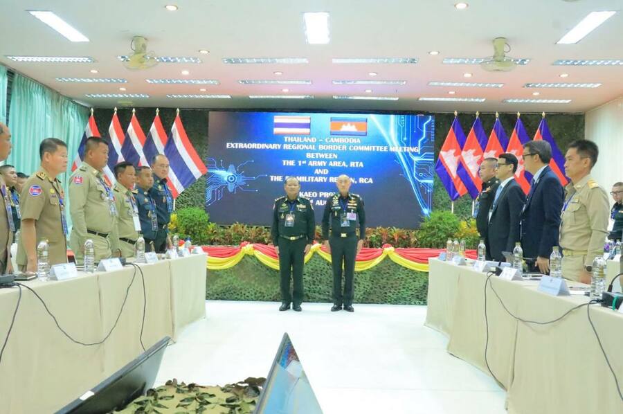 គណៈប្រតិភូកម្ពុជា ដឹកនាំដោយ ឧត្តមសេនីយ៍ឯក ឯក សំអូន មេបញ្ជាការយោធភូមិភាគទី៥ និងជាសហប្រធាននៃកិច្ចប្រជុំវិសាមញ្ញរបស់គណៈកម្មាធិការព្រំដែនថ្នាក់យោធភូមិភាគ (RBC)។ គណៈប្រតិភូថៃ ដឹកនាំដោយ ឧត្តមសេនីយ៍ឯក Amarit Boonsuya មេបញ្ជាការ កងទ័ពភូមិភាគទី១ និងជាសហប្រធាននៃកិច្ចប្រជុំវិសាមញ្ញរបស់គណៈកម្មាធិការព្រំដែនថ្នាក់យោធភូមិភាគ (RBC)។