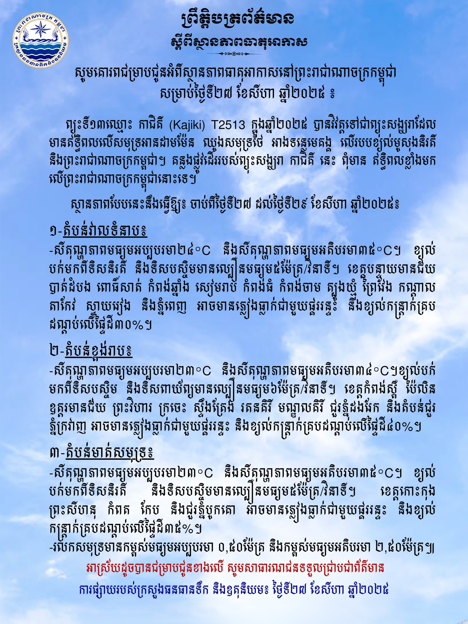 (រាជធានីភ្នំពេញ)៖ នៅព្រឹកថ្ងៃទី ២៧ ខែសីហា ឆ្នាំ ២០២៥ នេះ ក្រសួងធនធានទឹក និងឧតុនិយម បានឱ្យដឹងថា កម្ពុជាទទួលរងឥទ្ធិពលពី ព្យុះទី១៣ ឈ្មោះ ‹‹កាជិគី›› ដែលអាចនឹងមានភ្លៀងធ្លាក់ ខ្យល់កន្ត្រាក់ និងផ្គររន្ទះតាមតំបន់មួយចំនួន។