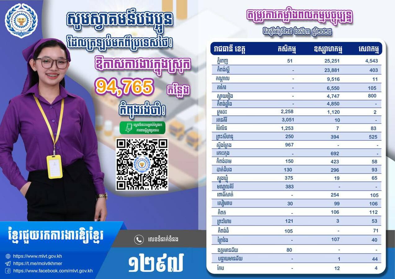 យោងតាមការចេញសេចក្តីប្រកាសរបស់ ក្រសួងព័ត៍មាន កាលពីថ្ងៃទី ២៩ ខែសីហា ឆ្នាំ ២០២៥ នេះបានឱ្យដឹងថា ឱកាសការងារចំនួន ៩៤,៧៦៥កន្លែង នៅទូទាំងរាជធានី-ខេត្ត ទាំង២៥ កំពុងរង់ចាំបងប្អូនប្រជាពលរដ្ឋដែលកំពុងស្វែងរកការងារធ្វើ ជាពិសេសបងប្អូនប្រជាពលរដ្ឋដែលទើបវិលត្រឡប់មកពីប្រទេសថៃ។