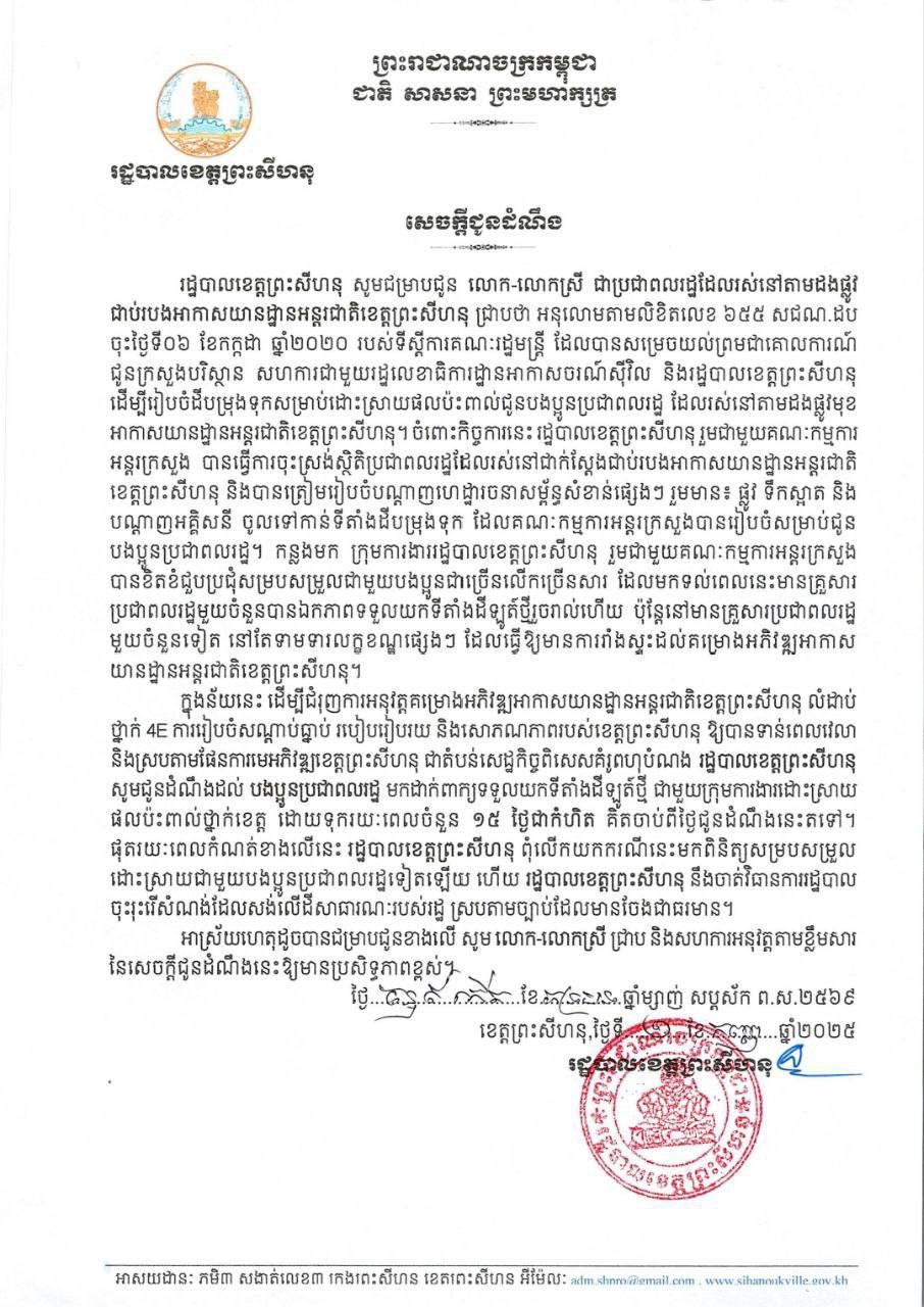 ក្នុងន័យនេះ ដើម្បីជំរុញការអនុវត្តគម្រោងអភិវឌ្ឍអាកាសយានដ្ឋានអន្តរជាតិខេត្តព្រះសីហនុ លំដាប់ ថ្នាក់ 4E ការរៀបចំសណ្តាប់ធ្នាប់ របៀបរៀបរយ និងសោភណភាពរបស់ខេត្តព្រះសីហនុ ឱ្យបានទាន់ពេលវេលា និងស្របតាមផែនការមេអភិវឌ្ឍខេត្តព្រះសីហនុ ជាតំបន់សេដ្ឋកិច្ចពិសេសគំរូពហុបំណង រដ្ឋបាលខេត្តព្រះសីហនុ សូមជូនដំណឹងដល់ បងប្អូនប្រជាពលរដ្ឋ មកដាក់ពាក្យទទួលយកទីតាំងដីឡូត៍ថ្មី ជាមួយក្រុមការងារដោះស្រាយ ផលប៉ះពាល់ថ្នាក់ខេត្ត ដោយទុករយៈពេលចំនួន ១៥ ថ្ងៃជាកំហិត គិតចាប់ពីថ្ងៃជូនដំណឹងនេះតទៅ។ ផុតរយៈពេលកំណត់ខាងលើនេះ រដ្ឋបាលខេត្តព្រះសីហនុ ពុំលើកយកករណីនេះមកពិនិត្យសម្របសម្រួល ដោះស្រាយជាមួយបងប្អូនប្រជាពលរដ្ឋទៀតឡើយ ហើយ រដ្ឋបាលខេត្តព្រះសីហនុ នឹងចាត់វិធានការរដ្ឋបាល ចុះរុះរើសំណង់ដែលសង់លើដីសាធារណៈរបស់រដ្ឋ ស្របតាមច្បាប់ដែលមានចែងជាធរមាន៕