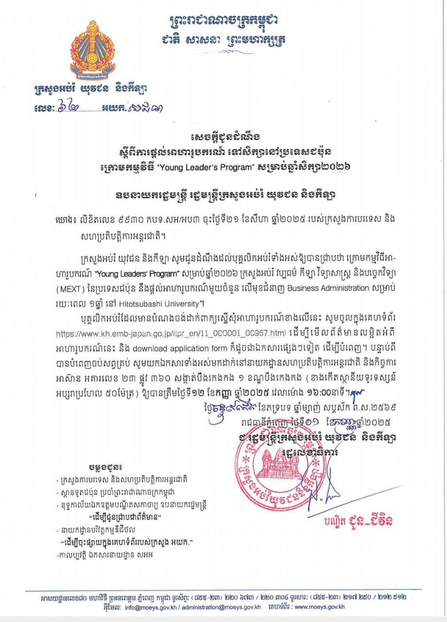 តាមសេចក្ដីជូនដំណឹងរបស់ ក្រសួងអប់រំ យុវជន និងកីឡា ជូនដំណឹងដល់បុគ្គលិកអប់រំទាំងអស់ឱ្យបានជ្រាបថា ក្រោមកម្មវិធីអា ហារូបករណ៍ ‹‹Young Leaders Program›› សម្រាប់ឆ្នាំ២០២៦ ក្រសួងអប់រំ វប្បធម៌ កីឡា វិទ្យាសាស្ត្រ និងបច្ចេកវិទ្យា (MEXT) នៃប្រទេសជប៉ុន នឹងផ្តល់អាហារូបករណ៍មួយចំនួន លើមុខជំនាញ Business Administration សម្រាប់ រយៈពេល ១ឆ្នាំ នៅ Hitotsubashi University។