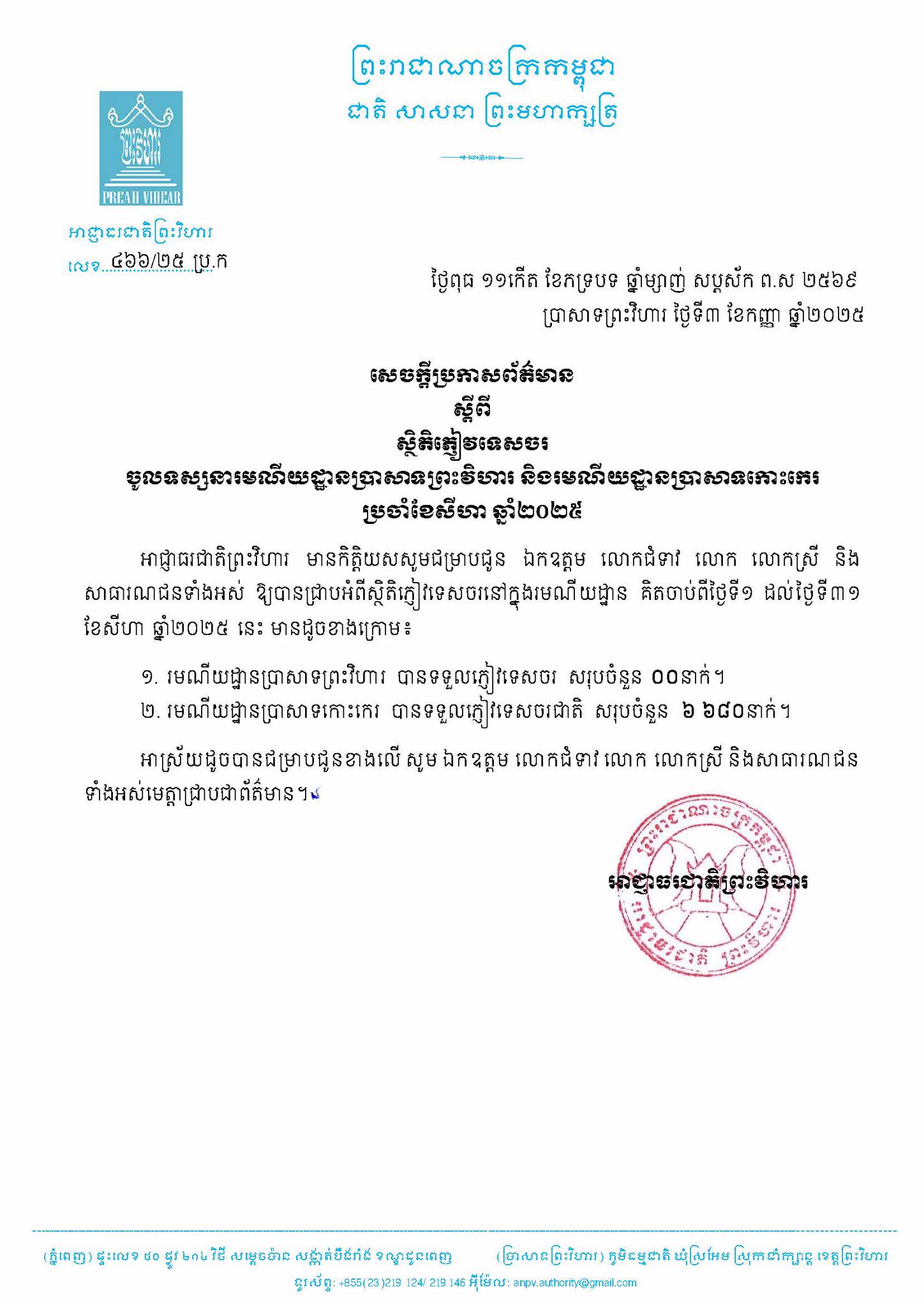 អាជ្ញាធរជាតិព្រះវិហារ បង្ហាញពីចំនួនភ្ញៀវទេសចរ ដែលបានចូលទស្សនារមណីយដ្ឋានប្រាសាទព្រះវិហារ និងរមណីយដ្ឋានប្រាសាទកោះកេរ ប្រចាំខែសីហា ឆ្នាំ២០២៥