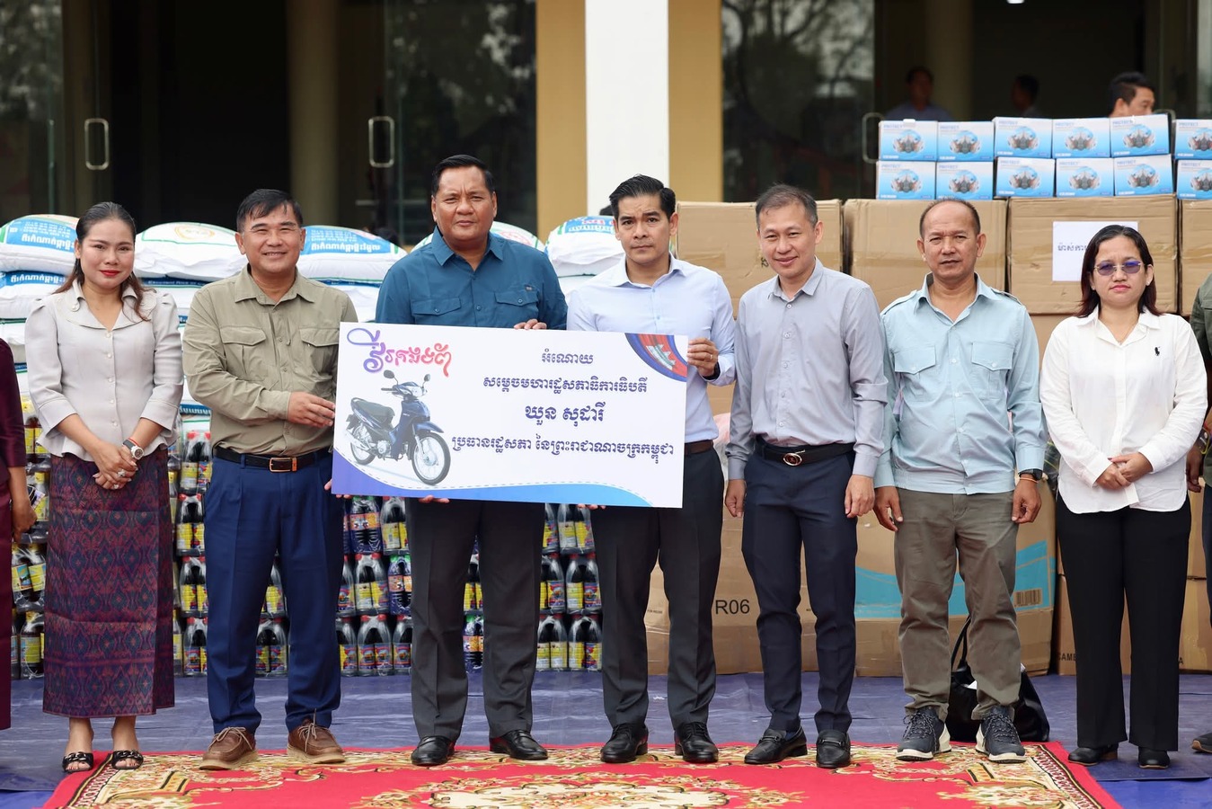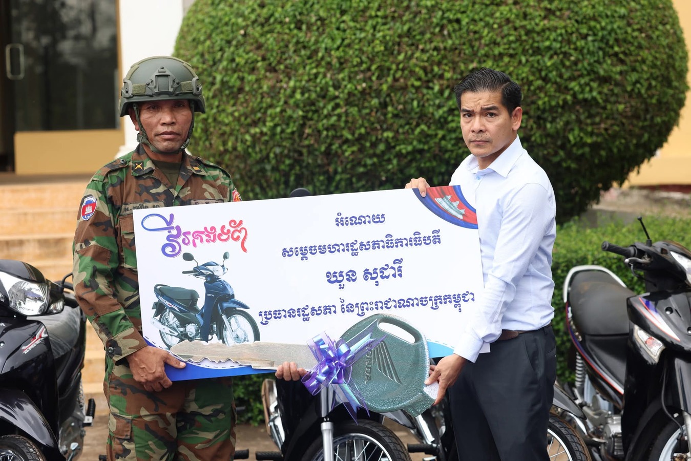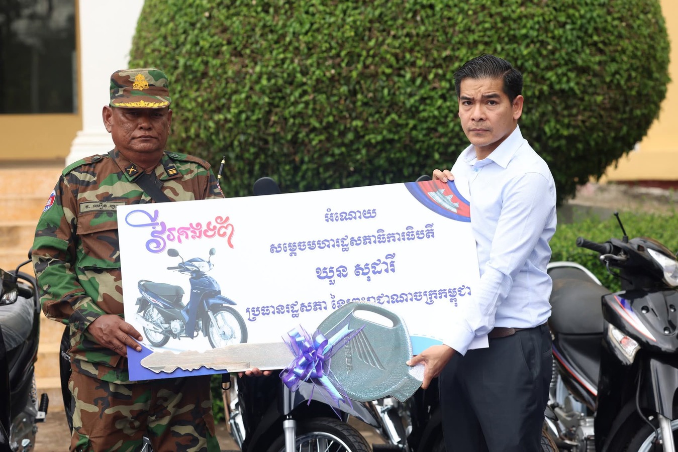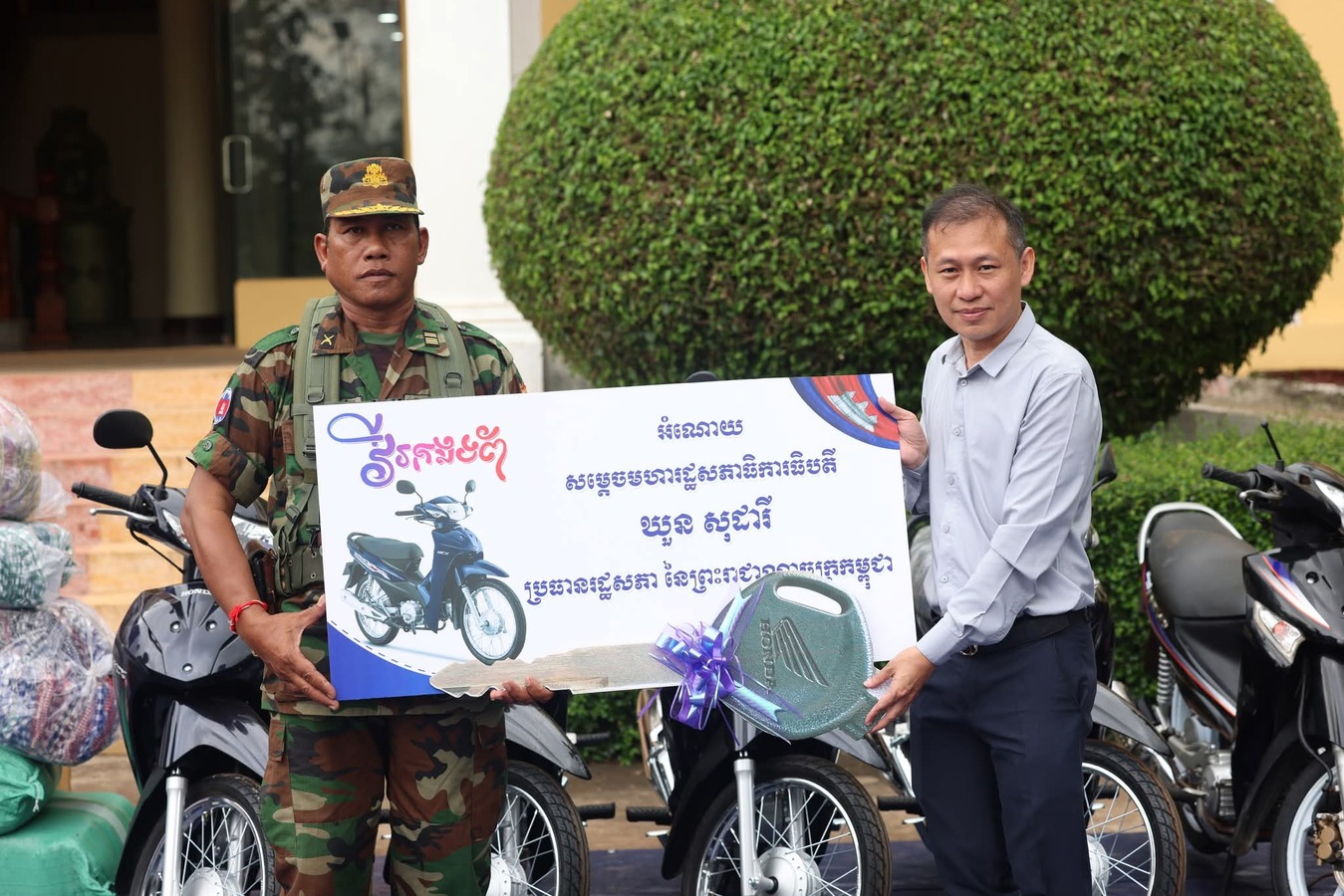 សូមជម្រាបថាអំណោយរបស់ សម្តេចប្រធានរដ្ឋសភា ដែលចែកជូនវីរកងព័ទ និងពលរដ្ឋភៀសសឹកនៅក្នុងខេត្តឧត្តរមានជ័យ នៅក្នុងឱកាសនេះ មានថវិកាចំនួន១០៥លានរៀល ម៉ូតូ១២គ្រឿង អង្ករ១០០បាវ រួមនិងសម្ភារៈប្រើប្រាស់ និងគ្រឿងឧបភោគបរិភោគជាច្រើនទៀត។ អំណោយទំាងអស់នេះជារបស់សម្តចប្រធានរដ្ឋសភាផ្ទាល់ និងទទួលពីសប្បុរជនមួយចំនួន ផងដែរ៕