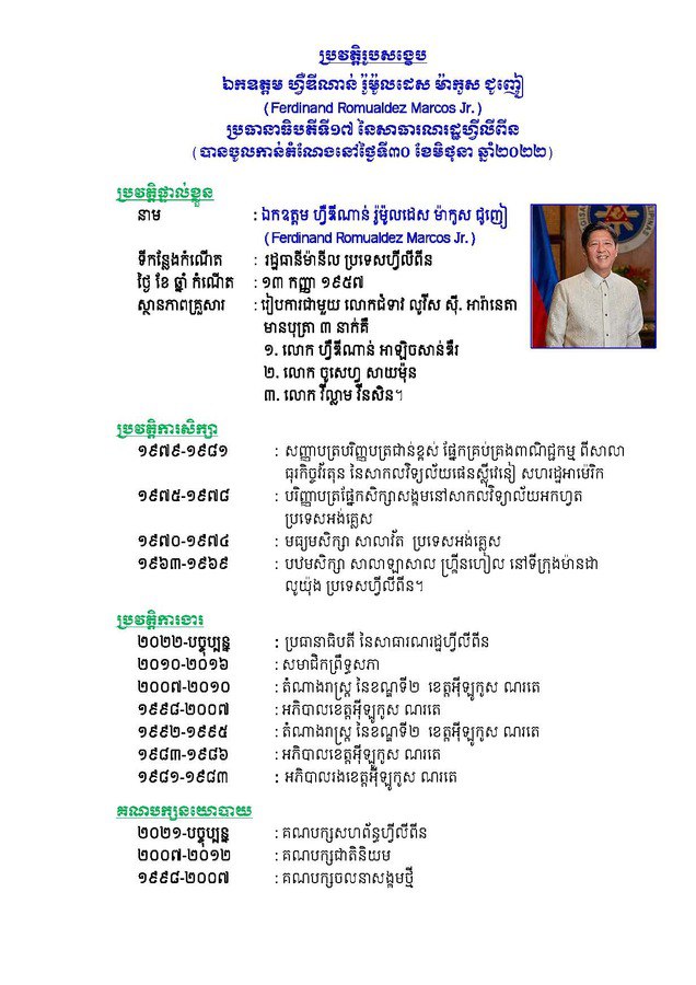 ក្រសួងការបរទេសបញ្ជាក់ថា ដំណើរទស្សនកិច្ចផ្លូវរដ្ឋរបស់ឯកឧត្តម​ប្រធានាធិបតី Ferdinand Romualdez Marcos Jr. នឹងពង្រឹងបន្ថែមទៀតនូវចំណងមិត្តភាព និងសាមគ្គីភាព ព្រមទាំងកិច្ចសហប្រតិបត្តិការលើគ្រប់វិស័យជាណាចរវាងប្រទេស និងប្រជាជនទាំងពីរ៕