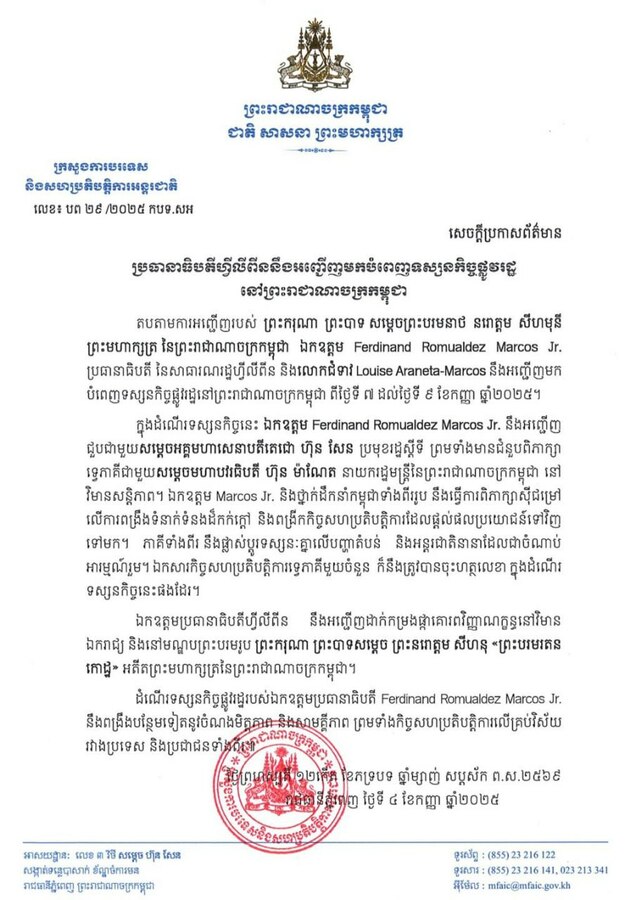 ដោយឡែកយោងតាមសេចក្តីប្រកាសព័ត៌មានរបស់ក្រសួងការបរទេសកម្ពុជាបានបញ្ជាក់ថា ឯកឧត្តម Ferdinand Romualdez Marcos Jr.ប្រធានាធិបតី នៃសាធារណរដ្ឋហ្វីលីពីន និងលោកជំទាវ Louise Araneta-Marcos​ នឹងអញ្ជើញមកបំពេញទស្សនកិច្ចផ្លូវរដ្ឋនៅព្រះរាជា​ណាចក្រកម្ពុជា ពីថ្ងៃទី ៧ ដល់ថ្ងៃទី ៩ ខែកញ្ញា ឆ្នាំ២០២៥។