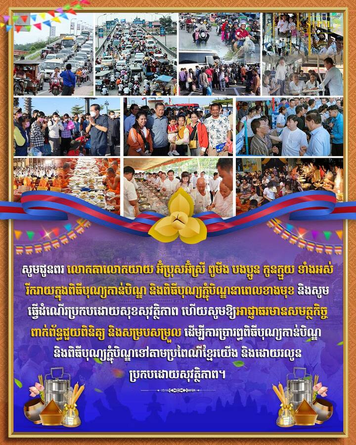 សម្តេចធិបតីនាយករដ្ឋមន្រ្តីនៃកម្ពុជា ក្រើនរំលឹកដល់ពលរដ្ឋគោរពច្បាប់ចរាចរណ៍ឲ្យបានខ្ជាប់ខ្ជួន ពេលធ្វើដំណើរ ក្នុងឱកាសបុណ្យកាន់បិណ្ឌនេះ