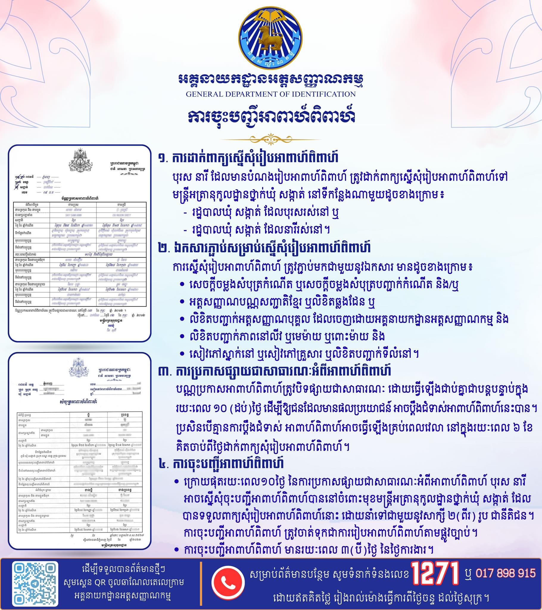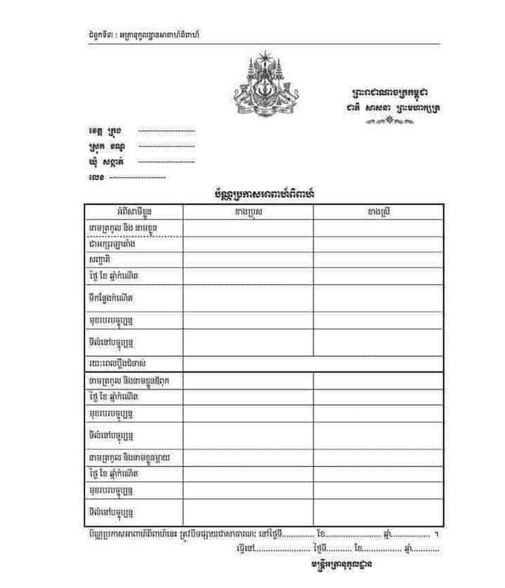 (រាជធានីភ្នំពេញ)៖ អគ្គនាយកដ្ឋានអត្តសញ្ញាណកម្ម បានឱ្យដឹងពី ការចុះបញ្ជីអាពាហ៍ពិពាហ៍ ត្រូវចុះនៅរដ្ឋបាលឃុំ សង្កាត់ និងត្រូវមានឯកសារមួយចំនួនមកជាមួយ។ លើសពីនេះ អគ្គនាយកដ្ឋានអត្តសញ្ញាណកម្ម ក៏បានបន្ថែពី នីតិវិធីបែបបទក្នុងការចុះបញ្ជីអាពាហ៍ពិពាហ៍ផងដែរ។
