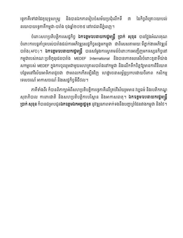 ចំពោះសហប្រតិបត្តិការសេដ្ឋកិច្ច ឯកឧត្តមឧបនាយករដ្ឋមន្ត្រី ប្រាក់ សុខុន បានថ្លែងអំណរគុណ ចំពោះការបន្តគាំទ្ររបស់បារាំងដល់ការអភិវឌ្ឍសេដ្ឋកិច្ចសង្គមកម្ពុជា ជាពិសេសតាមរយៈទីភ្នាក់ងារអភិវឌ្ឍន៍ បារាំង(AFD)។