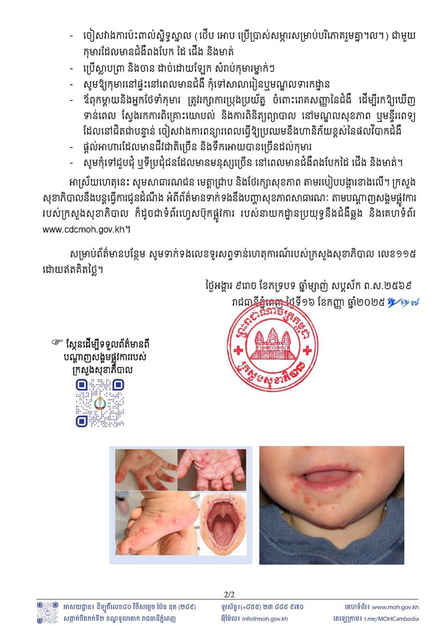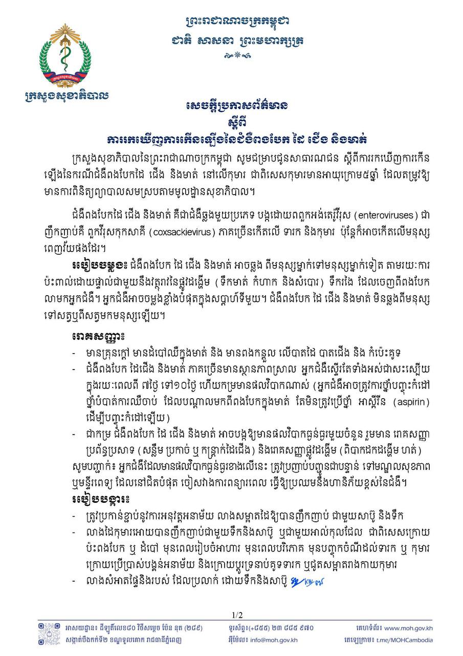 ក្នុងសេចក្ដីប្រកាសពទត៌មានរបស់ ក្រសួងសុខាភិបាលនៃព្រះរាជាណាចក្រកម្ពុជា បានបញ្ជាក់ថា ការរកឃើញការកើន ឡើងនៃករណីជំងឺពងបែកដៃ ជើង និងមាត់ នៅលើកុមារ ជាពិសេសកុមារមានអាយុក្រោម៥ឆ្នាំ ដែលតម្រូវឱ្យ មានការពិនិត្យព្យាបាលសមស្របតាមមូលដ្ឋានសុខាភិបាល។