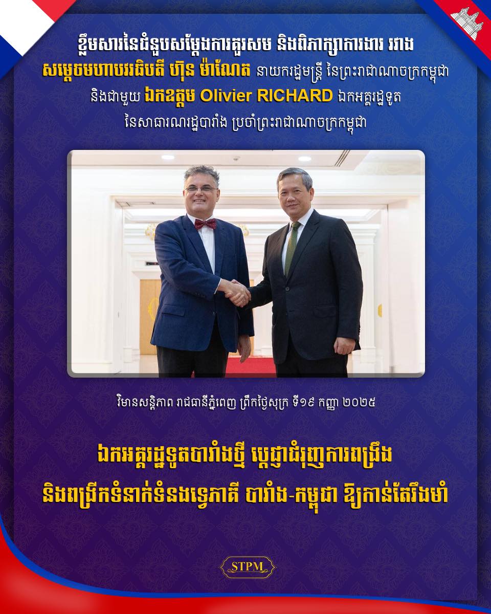 នាព្រឹកថ្ងៃទី១៩ ខែកញ្ញា ឆ្នាំ២០២៥, សម្ដេចមហាបវរធិបតី ហ៊ុន ម៉ាណែត នាយករដ្ឋមន្ត្រីនៃព្រះរាជាណាចក្រកម្ពុជា បានទទួលឯកឧត្តម Olivier RICHARD ឯកអគ្គរដ្ឋទូតវិសាមញ្ញ និងពេញសមត្ថភាពនៃសាធារណរដ្ឋបារាំង ប្រចាំព្រះរាជាណាចក្រកម្ពុជា ចូលសម្តែងការគួរសម និងពិភាក្សាការងារ នៅវិមានសន្តិភាព។