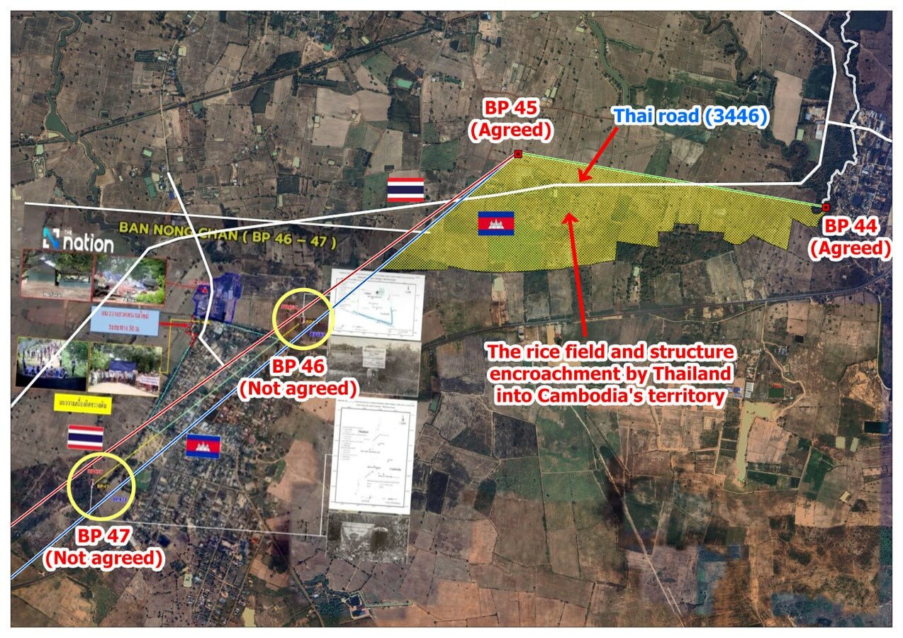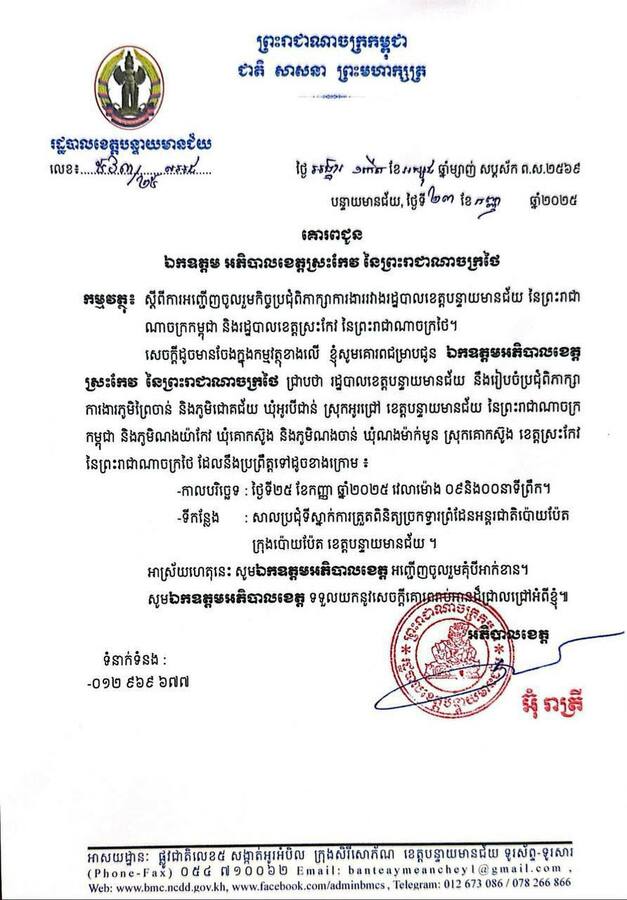 ចំពោះការស្នើរបស់ឯកឧត្តម អ៊ុំ រាត្រី ធ្វើឡើងនៅព្រឹកថ្ងៃទី២៥ ខែកញ្ញា ឆ្នាំ២០២៥ នេះ ក្រោយមិនមានការឆ្លើយតបពីអភិបាលខេត្តស្រះកែវចំពោះលិខិតអញ្ជើញកាលពីថ្ងៃទី២៣ ខែកញ្ញា ឆ្នាំ២០២៥ របស់អភិបាលខេត្តបន្ទាយដើម្បីជួបប្រជុំពិភាក្សាការងាររវាងរដ្ឋបាលខេត្តបន្ទាយមានជ័យ និងខេត្តស្រះកែវទាក់ទងនឹងភូមិព្រៃចាន់ និងភូមិជោគជ័យ ឃុំអូរបីជាន់ ស្រុកអូរជ្រៅ ខេត្តបន្ទាយមានជ័យ នៃព្រះរាជាណាចក្រកម្ពុជា និងភូមិណងយ៉ាកែវ ឃុំគោកស៊ូង និងភូមិណងចាន់ ឃុំណងម៉ាក់មូន ស្រុកគោកស៊ូង ខេត្តស្រះកែវ នៃព្រះរាជាណាចក្រថៃ។