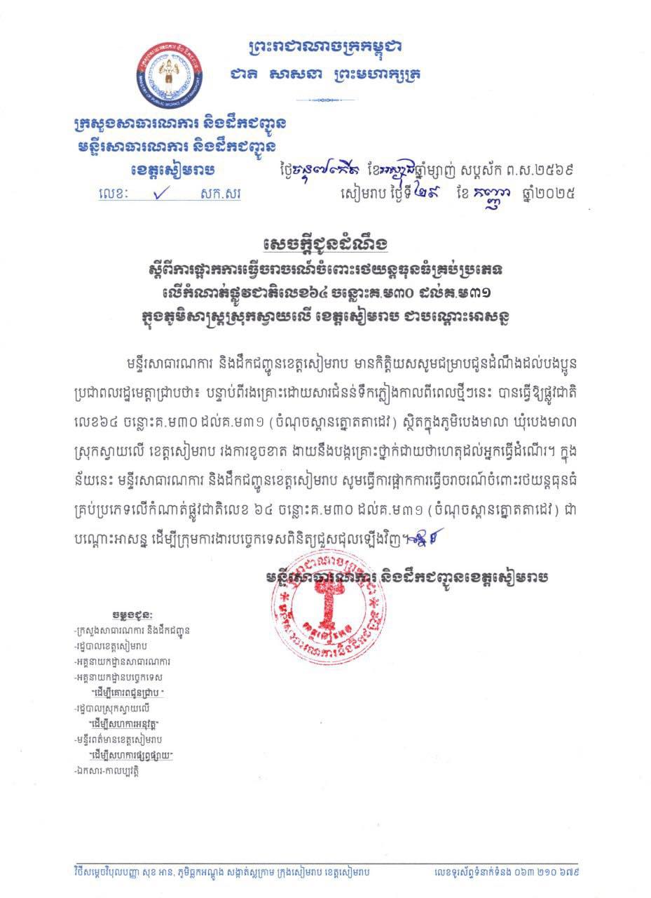 តាមរយៈសេចក្ដីជូនដំណឹងរបស់ មន្ទីរសាធារណការ និងដឹកជញ្ជូនខេត្ដសៀមរាប នៅរសៀលថ្ងៃទី ២៩ ខែកញ្ញា ឆ្នាំ ២០២៥ នេះ បានឱ្យដឹងថា បន្ទាប់ពីរងគ្រោះដោយសារជំនន់ទឹកភ្លៀងកាលពីពេលថ្មីៗនេះ បានធ្វើឱ្យផ្លូវជាតិ លេខ៦៤ ចន្លោះគ.ម៣០ ដល់គ.ម៣១ (ចំណុចស្ពានត្នោតតាដេវ) ស្ថិតក្នុងភូមិបេងមាលា ឃុំបេងមាលា ស្រុកស្វាយលើ ខេត្តសៀមរាប រងការខូចខាត ងាយនឹងបង្កគ្រោះថ្នាក់ជាយថាហេតុដល់អ្នកធ្វើដំណើរ។ ក្នុង ន័យនេះ មន្ទីរសាធារណការ និងដឹកជញ្ជូនខេត្តសៀមរាប សូមធ្វើការផ្អាកការធ្វើចរាចរណ៍ចំពោះរថយន្តធុនធំ គ្រប់ប្រភេទលើកំណាត់ផ្លូវជាតិលេខ ៦៤ ចន្លោះគីឡូម៉ែត្រ៣០ ដល់គីឡូម៉ែត្រ៣១ (ចំណុចស្ពានត្នោតតាដេវ) ជាបណ្តោះអាសន្ន ដើម្បីក្រុមការងារបច្ចេកទេសពិនិត្យជួសជុលឡើងវិញ៕