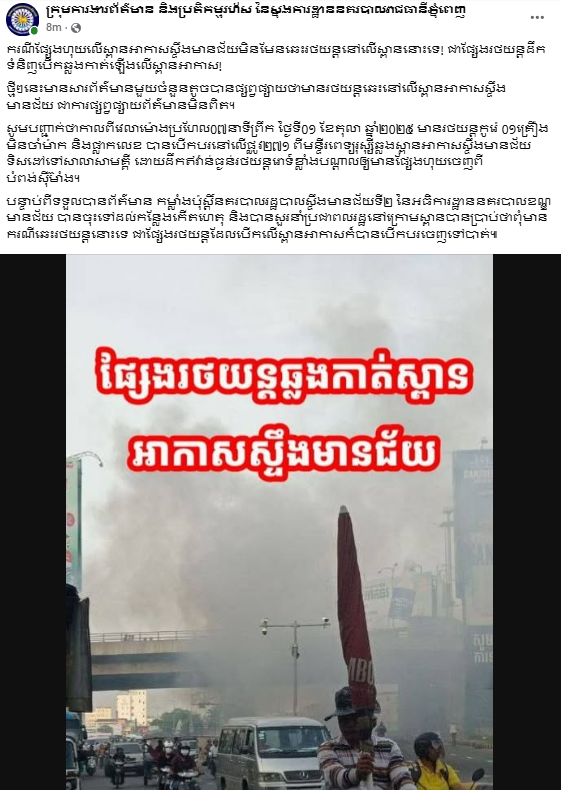 ក្រុមការងារព័ត៌មាន និងប្រតិកម្មរហ័ស នៃស្នងការដ្ឋាននគរបាលរាជធានីភ្នំពេញ បញ្ជាក់បែបនេះ ដោយសារថ្មីៗនេះមានសារព័ត៌មានមួយចំនួនតូចបានផ្សព្វផ្សាយថាមានរថយន្តឆេះនៅលើស្ពានអាកាសស្ទឹងមានជ័យ ជាការផ្សព្វផ្សាយព័ត៌មានមិនពិត។