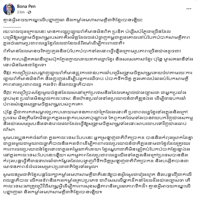 (រាជធានីភ្នំពេញ)៖ នៅរសៀលថ្ងៃទី ២ ខែតុលា ឆ្នាំ ២០២៥ នេះ តាមការបង្ហោះគណនីផ្ទាល់របស់ ឯកឧត្តម ប៉ែន បូណា ប្រធានអង្គភាពអ្នកនាំពាក្យរដ្ឋាភិបាល បានបញ្ជាក់ថា រយៈពេលចុងក្រោយនេះ មានការផ្សព្វផ្សាយព័ត៌មានមិនពិត ប្រឌិត បំផ្លើសបំភ្លៃជាច្រើនដែលបម្រើឱ្យសង្គ្រាមចិត្តសាស្ត្ររបស់ភាគីអមិត្ត ដែលចង់បំផ្លាញកម្ពុជាក្នុងគោលដៅបំបែកបំបាក់សាមគ្គីភាពក្នុងចំណោមប្រជាពលរដ្ឋខ្មែរដែលជាខែលដ៏រឹងមាំដើម្បីការពារជាតិ។