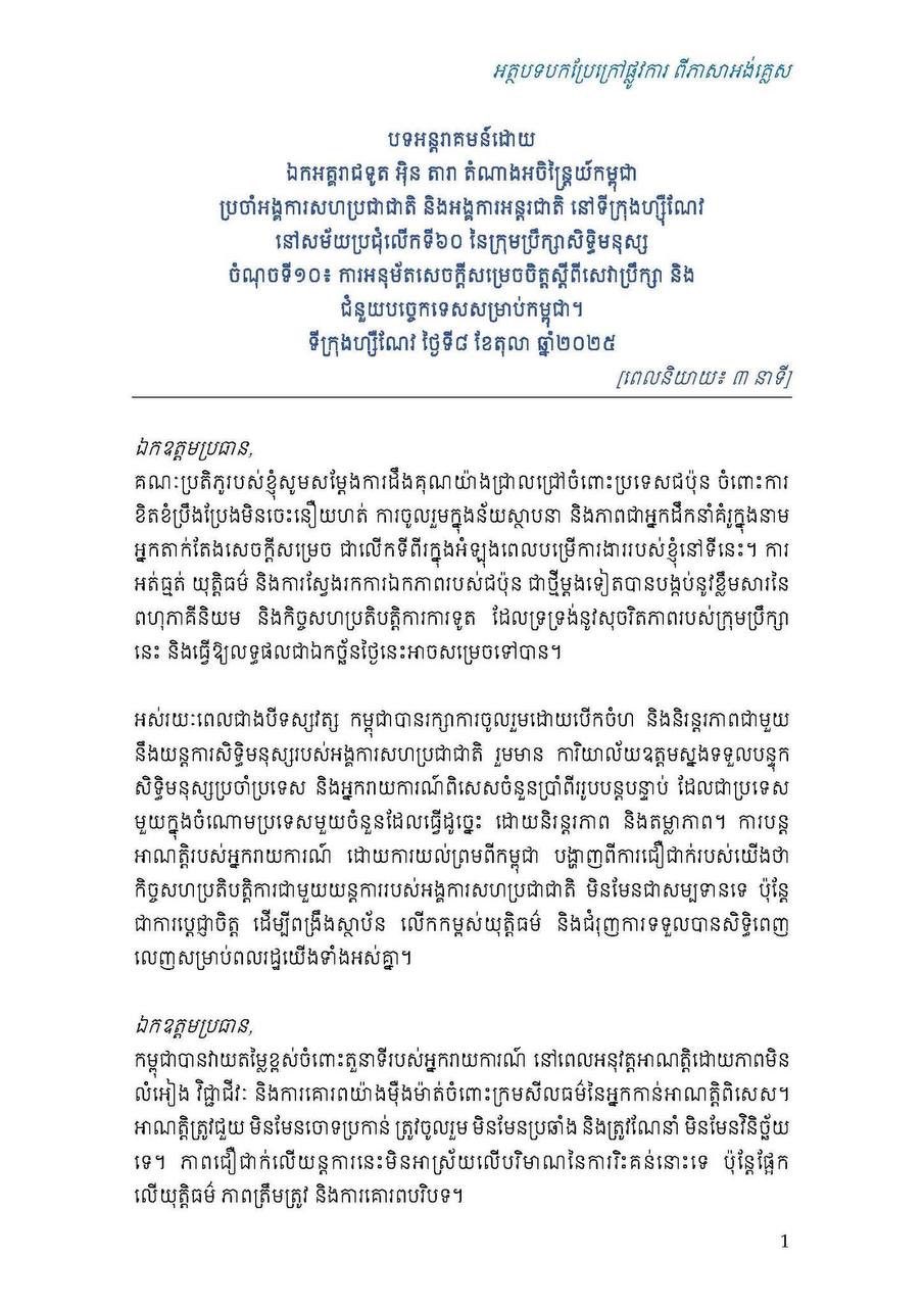 កាលព្រឹកថ្ងៃទី ៨ ខែតុលា ឆ្នាំ ២០២៥ ក្នុងសម័យប្រជុំលើកទី៦០ នៃក្រុមប្រឹក្សាសិទ្ធិមនុស្ស ឯកឧត្តម ឯកអគ្គរាជទូត អ៊ិន តារា តំណាងអចិន្ត្រៃយ៍កម្ពុជា ប្រចាំអង្គការសហប្រជាជាតិ នៅទីក្រុងហ្សឺណែវ បានធ្វើបទអន្តរាគមន៍ ក្នុងអំឡុងពេលអនុម័តសេចក្តីសម្រេច ស្តីពីសេវាប្រឹក្សា និងជំនួយបច្ចេកទេសសម្រាប់កម្ពុជា (បទអន្តរាគមន៍ភ្ជាប់)។