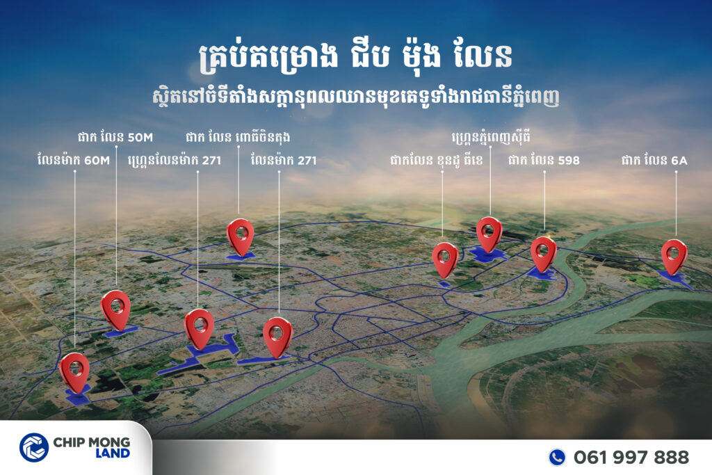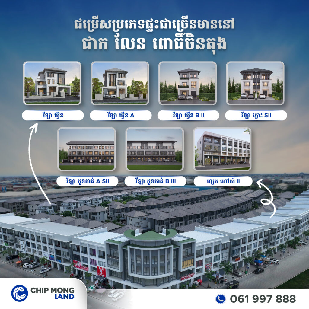 អតិថិជនដែលកំពុងស្វែងរកផ្ទះដែលអាចទិញភ្លាមចូលរស់នៅបានភ្លាម ស្ថិតនៅក្នុងទីតាំងដែលមានសក្តានុពល ម៉ូតផ្ទះស្អាត សំណង់ល្អគង់វង្សតជំនាន់ ឥឡូវនេះ ជីប ម៉ុង លែន មានការផ្តល់ជូនជាពិសេសសម្រាប់គេហដ្ឋានស្ថិតនៅទីតាំងពិសេសៗដល់អតិថិជនគ្រប់រូប មានច្រើនប្រភេទផ្ទះច្រើនគម្រោងដូចជា៖