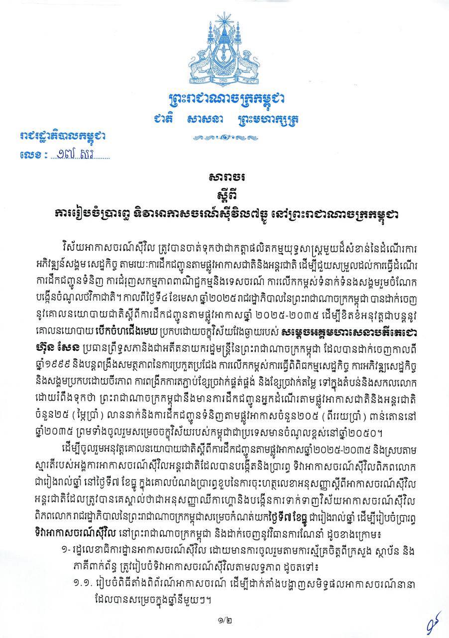 (រាជធានីភ្នំពេញ)៖ នៅព្រឹកថ្ងៃទី ១០ ខែតុលា ឆ្នាំ ២០២៥ នេះ តាមការចេញផ្សាយរបស់ អង្គភាពអ្នកនាំពាក្យរាជរដ្ឋាភិបាល បានឱ្យដឹងថា រាជរដ្ឋាភិបាល បានចេញនូវ សារាចរស្ដីពី ការរៀបចំប្រារព្ធ ទិវាអាកាសចរណ៍ស៊ីវិល៧ធ្នូ នៅព្រះរាជាណាចក្រកម្ពុជា។ ដោយរាជរដ្ឋាភិបាល នឹងរៀបចំប្រារព្ធ ទិវាអាកាសចរណ៍ស៊ីវិល៧ធ្នូ ហើយក៏មានដាក់តាំងបង្ហាញពីសមិទ្ធផលអាកាសចរណ៍នានាផងដែរ។