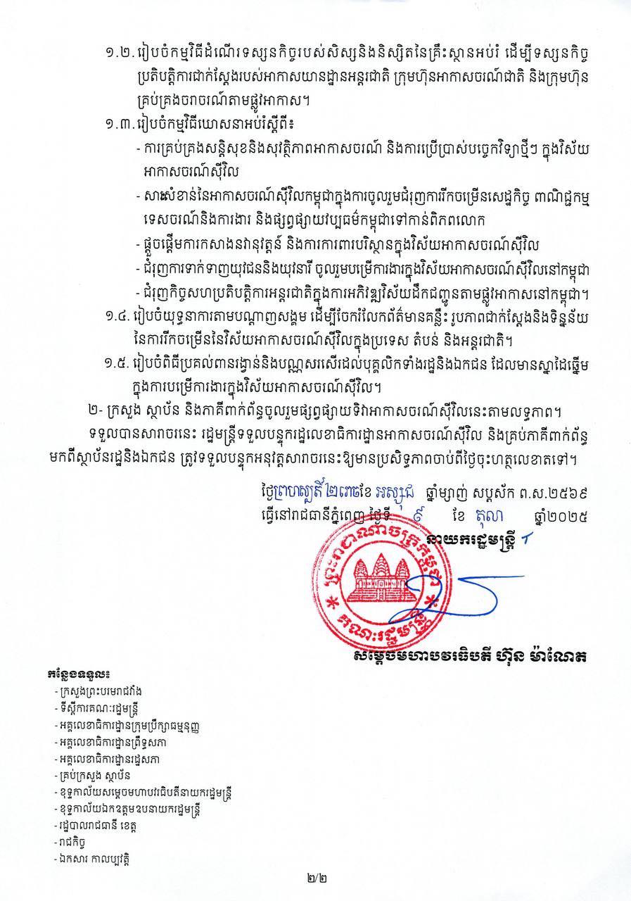 ២- ក្រសួង ស្ថាប័ន និងភាគីពាក់ព័ន្ធចូលរួមផ្សព្វផ្សាយទិវាអាកាសចរណ៍ស៊ីវិលនេះតាមលទ្ធភាព។