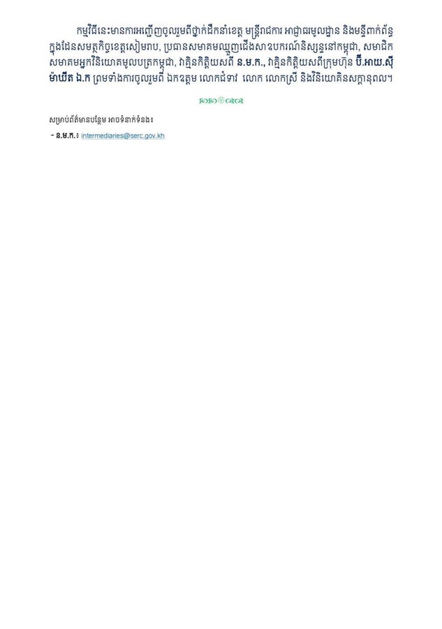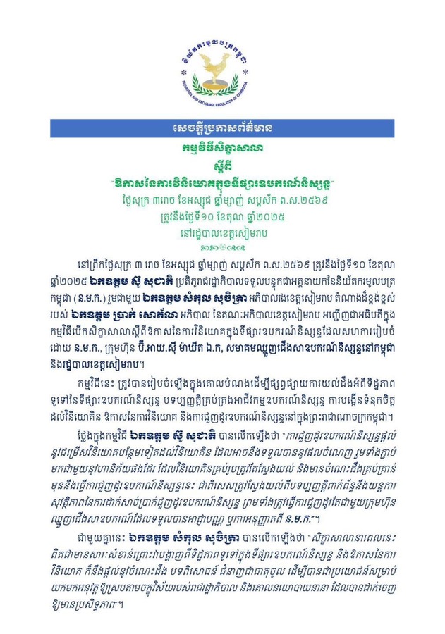 ការថ្លែងរបស់មន្ត្រីជាន់ខ្ពស់ខាងលើ បានធ្វើឡើងក្នុងបើកសិក្ខាសាលាស្តីពីឱកាសនៃការវិនិយោគក្នុងទីផ្សារឧបករណ៍និស្សន្ទដែលសហការរៀបចំ ដោយ ន.ម.ក., ក្រុមហ៊ុន ប៊ី.អាយ.ស៊ី ម៉ាឃីត ឯ.ក, សមាគមឈ្មួញជើងសាឧបករណ៍និស្សន្ទនៅកម្ពុជា និងរដ្ឋបាលខេត្តសៀមរាប នាថ្ងៃទី១០ ខែតុលា ឆ្នាំ២០២៥ម្សិលមិញនេះ៕
