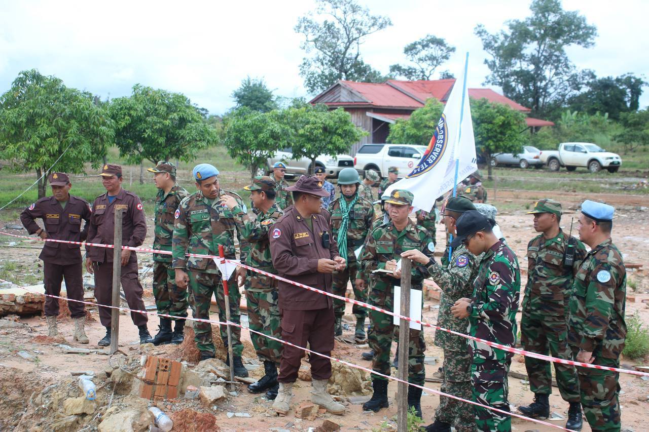 ក្រុមអ្នកសង្កេតការណ៍អន្តរកាល (IOT) ដឹកនាំដោយប្រទេសម៉ាឡេស៊ី ចុះពិនិត្យទីតាំងជាក់ស្តែង ដែលរងផលប៉ះពាល់ តាមរយៈការប្រើប្រាស់យន្តហោះចម្បាំងទំលាក់គ្រាប់ MK-84 នៅភូមិសែនរុងរឿង៤ ឃុំមរកត ស្រុកជាំក្សាន្ត ខេត្តព្រះវិហារ