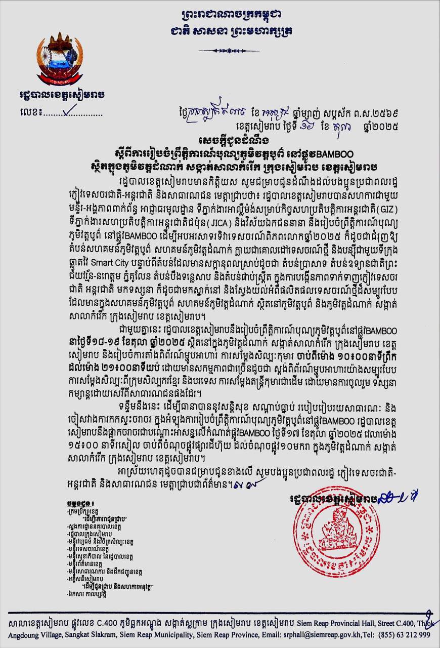 ទន្ទឹមនឹងនេះ ដើម្បីធានាបាននូវសន្តិសុខ សណ្តាប់ធ្នាប់ របៀបរៀបរយសាធារណៈ និង ចៀសវាងការកកស្ទះចរាចរ ក្នុងអំឡុងការរៀបចំព្រឹត្តិការណ៍បុណ្យភូមិវត្តបូព៌នៅផ្លូវBAMBOO រដ្ឋបាលខេត្ត សៀមរាបនឹងផ្អាកចរាចរជាបណ្ដោះអាសន្នលើកំណាត់ផ្លូវBAMBOO ថ្ងៃទី១៧ ខែតុលា ឆ្នាំ២០២៥ វេលាម៉ោង ១៥៖០០ នាទីរសៀល ចាប់ពីចំណុចផ្លូវផ្សារដីហ៊ុយ ដល់ចំណុចផ្លូវ១០មករា ក្នុងភូមិវត្តដំណាក់ សង្កាត់ សាលាកំរើក ក្រុងសៀមរាប ខេត្តសៀមរាប៕