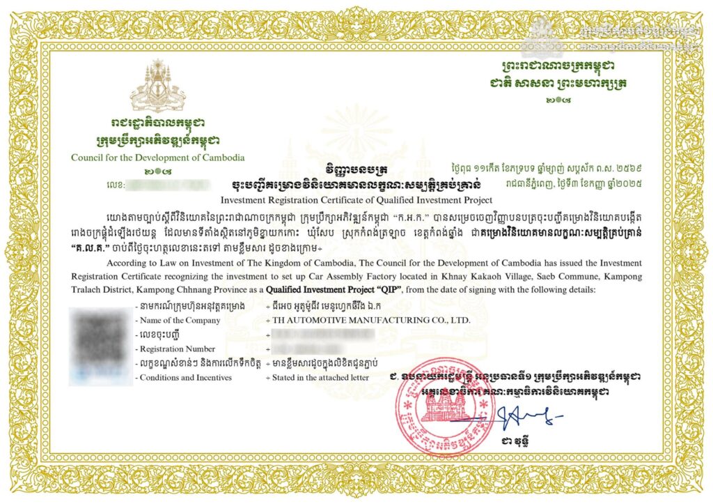 យោងតាមវិញ្ញាបនបត្រចុះបញ្ជីគម្រោងវិនិយោគបង្កើត រោងចក្រផ្តុំដំឡើងរថយន្ត គឺមានទីតាំងស្ថិតនៅភូមិខ្នាយកកោះ ឃុំសែប ស្រុកកំពង់ត្រឡាច ខេត្តកំពង់ឆ្នាំង៕